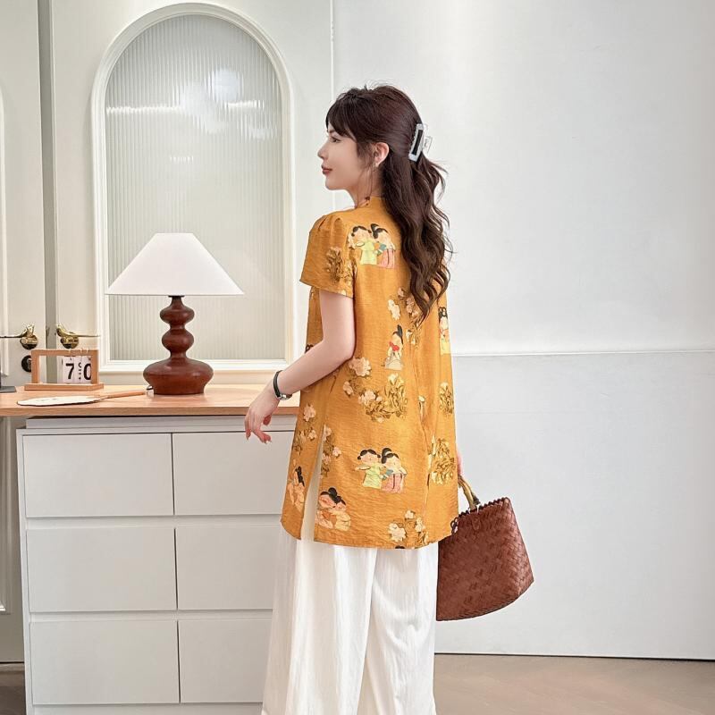 チャイナトップス レディース 大きいサイズ ゆったりサイズ エレガント 上品 中国風 プリント スタンドカラー マオカラー 半袖 ポリエステル 斜め襟 盤扣 スリット 大人 通勤 オフィス カジュアル イエロー グリーン ピンク