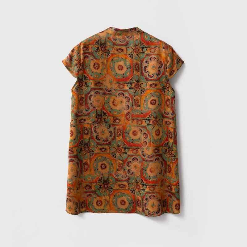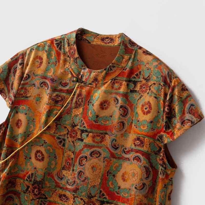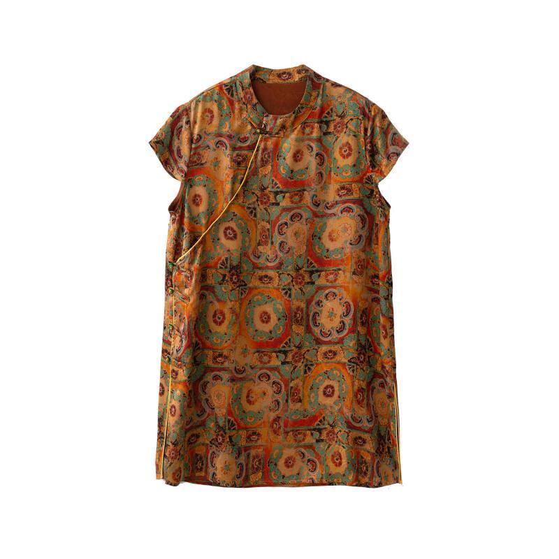 Tシャツ レディース 香雲紗 桑蚕シルク 五分袖 スタンドカラー 斜め前立て チャイナボタン 中国風 レトロ ブラウン ジャカード ストレートシルエット