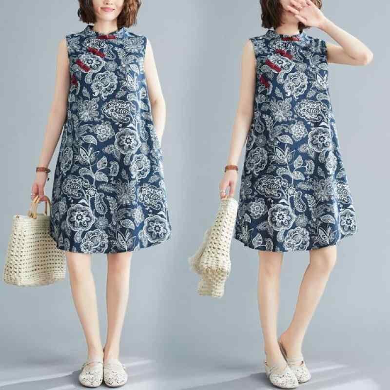 ワンピース レディース 大きいサイズ ゆったり ホルターネック ノースリーブ 綿麻 リネンコットン 体型カバー 着痩せ お腹周りカバー レトロ柄 チャイナボタン 旗袍風 夏物 普段使い お出かけ 大人カジュアル ダークブルー