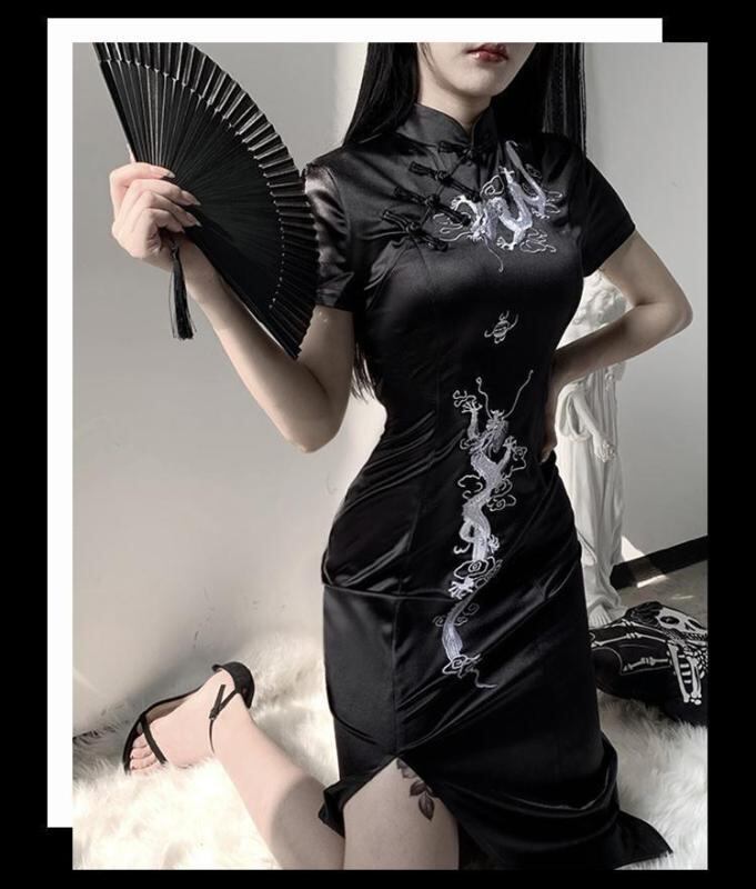 ワンピース レディース プラスサイズ 半袖 ショート丈 改良チャイナドレス 龍柄 盤扣デザイン スリット入り スタンドカラー ブラック 麻 ラミー混紡 ゆったり 体型カバー ストリート モード シック リラックスフィット 夏服