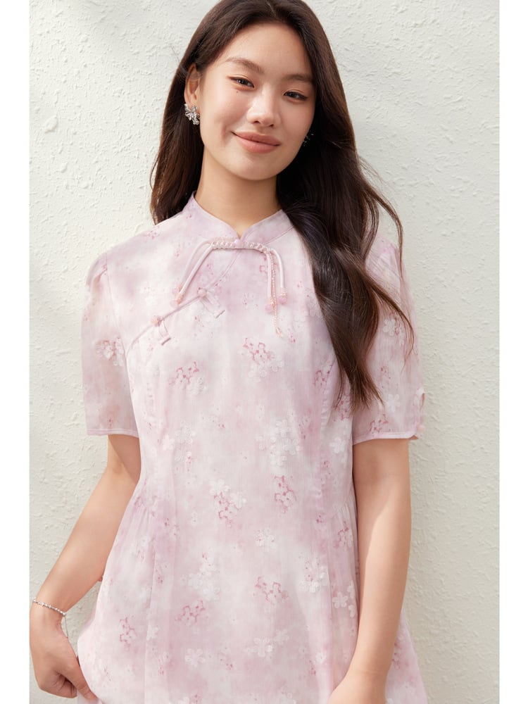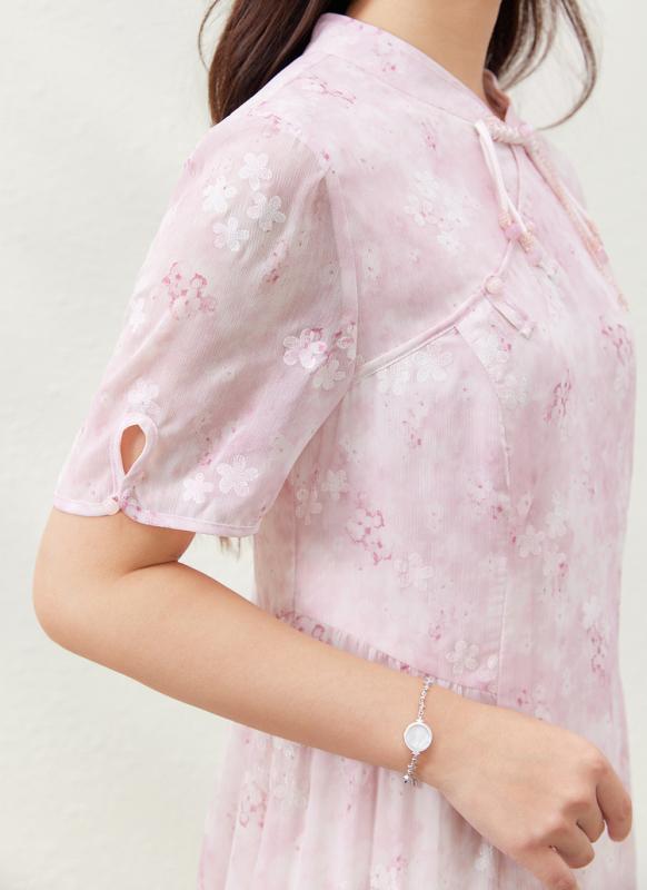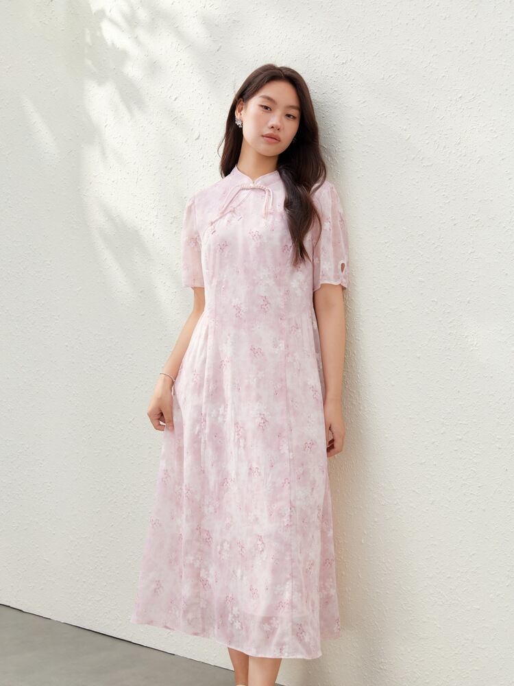 ワンピース レディース プラスサイズ チャイニーズスタイル スタンドカラー 花柄 Aライン ミモレ丈 五分袖 エレガント 通勤 ポリエステル ピンク