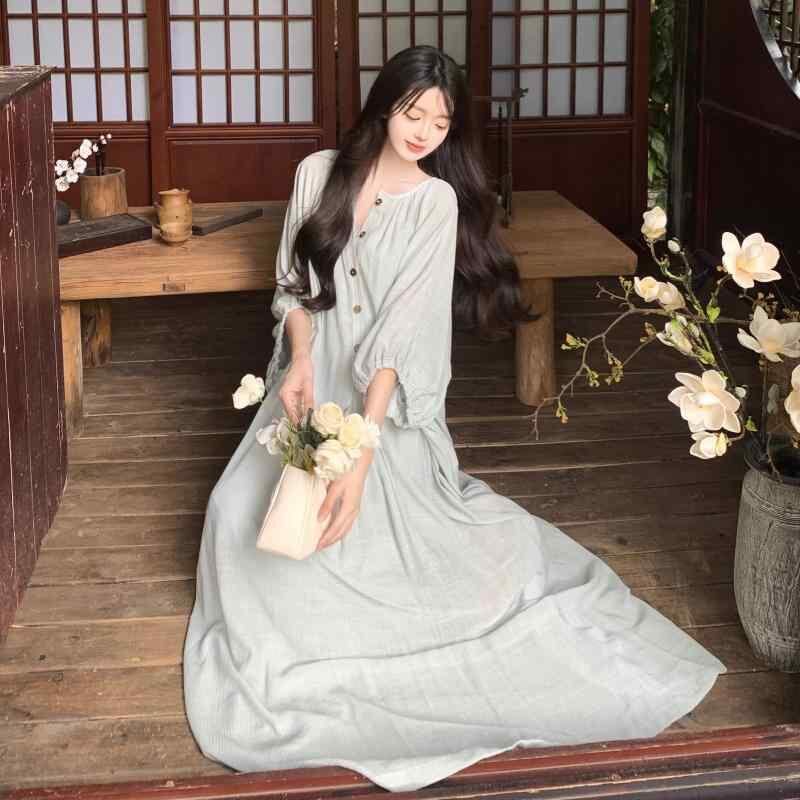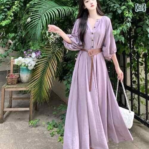 ・カテゴリ: ワンピース・スタイル: 文芸レトロ、中国風・素材: PVC 30%以下・柄: 無地・デザイン: ボタン、立体装飾・ネックライン: Vネック・袖丈: 長袖・袖の形: ランタンスリーブ・ウエスト: ハイウエスト・スカート丈: ミディ丈・スカート形状: Aライン、フリル・前立て: プルオーバー・カラー展開: パープル、ライトブルー・サイズ展開: M、L、XL、2XL、3XL、4XL