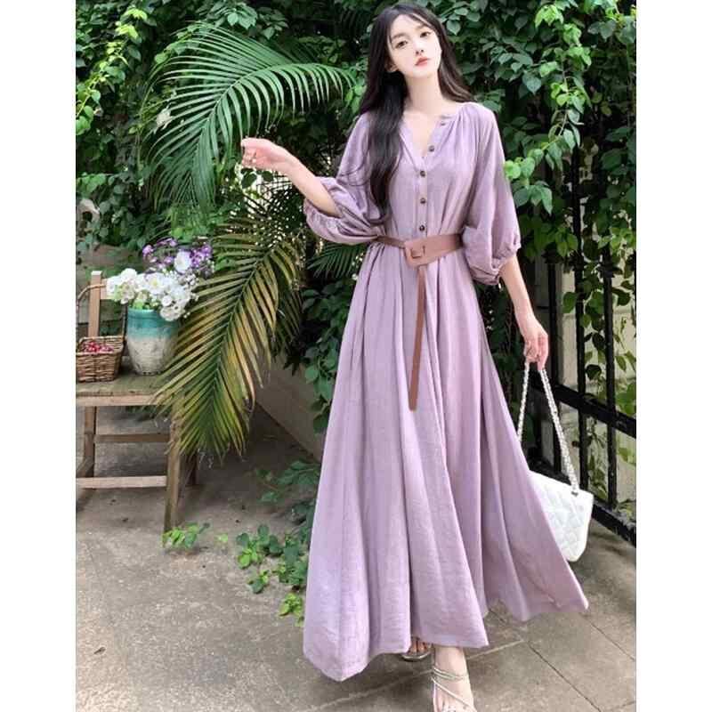 ワンピース レディース 大きいサイズ パープル 長袖 フレンチシック ドーパミンファッション エレガント Aライン ロング丈 ミディ丈 Vネック ランタンスリーブ ハイウエスト フリルヘム 初夏 ゆったり 体型カバー 着痩せ効果