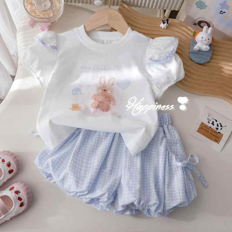 キッズ 女の子 韓国ファッション 上下セット 夏服 カートゥーンプリント 半袖Tシャツ チェック柄 リボン ウエストゴム ギャザーパンツ 2点セット
