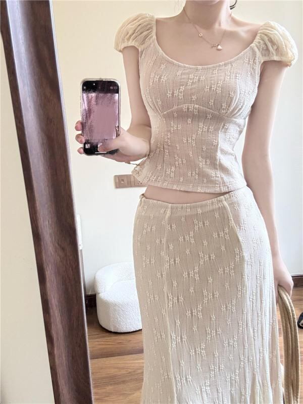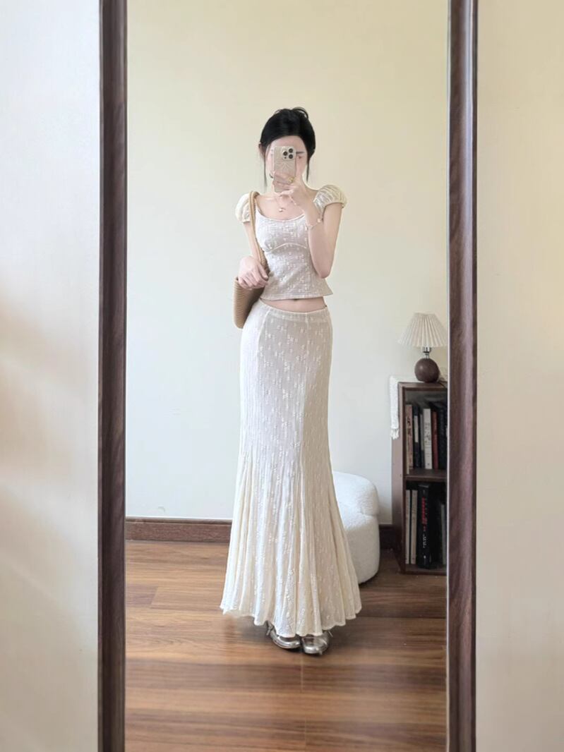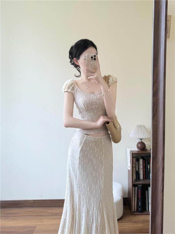 セットアップ レディース フレンチ レース ジャカード Uネック トップス マーメイドスカート 無地 ロング丈 ナイロン スパンデックス クロシェ編み エレガント 上品 きれいめ 大人 アプリコットカラー