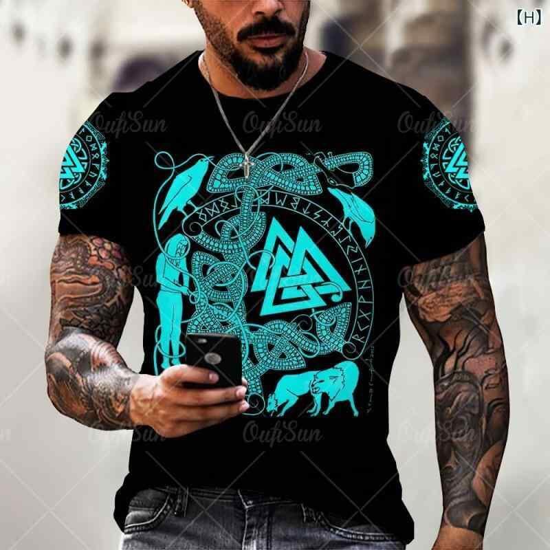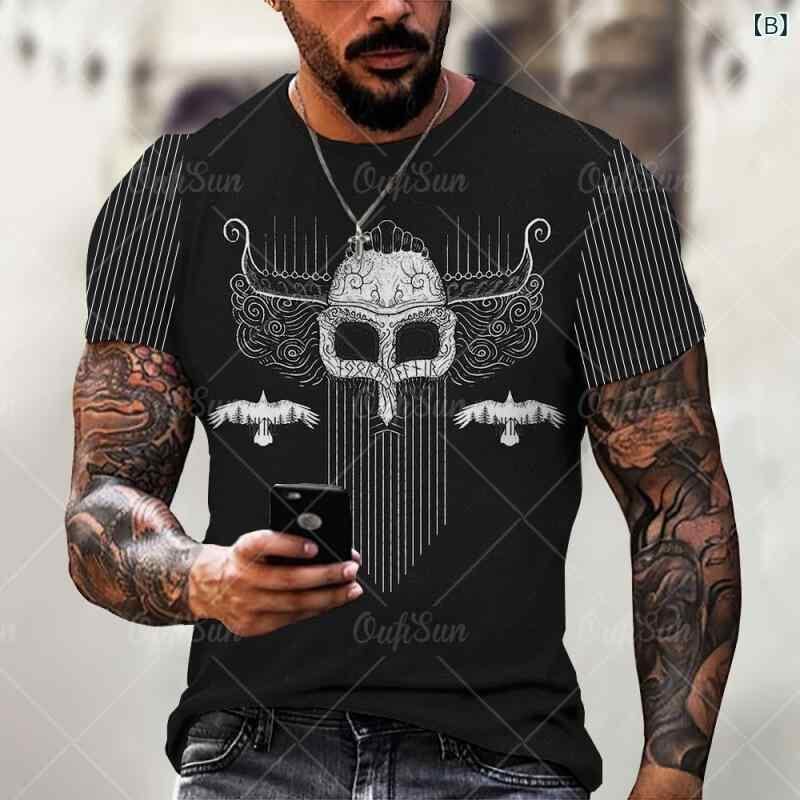 Tシャツ メンズ 半袖 バイキング カラス タトゥー 3Dプリント 夏 クルーネック ゆったり ルーズフィット 原宿系 ストリートファッション 吸湿速乾 ポリエステル 再生繊維 トップス カジュアル