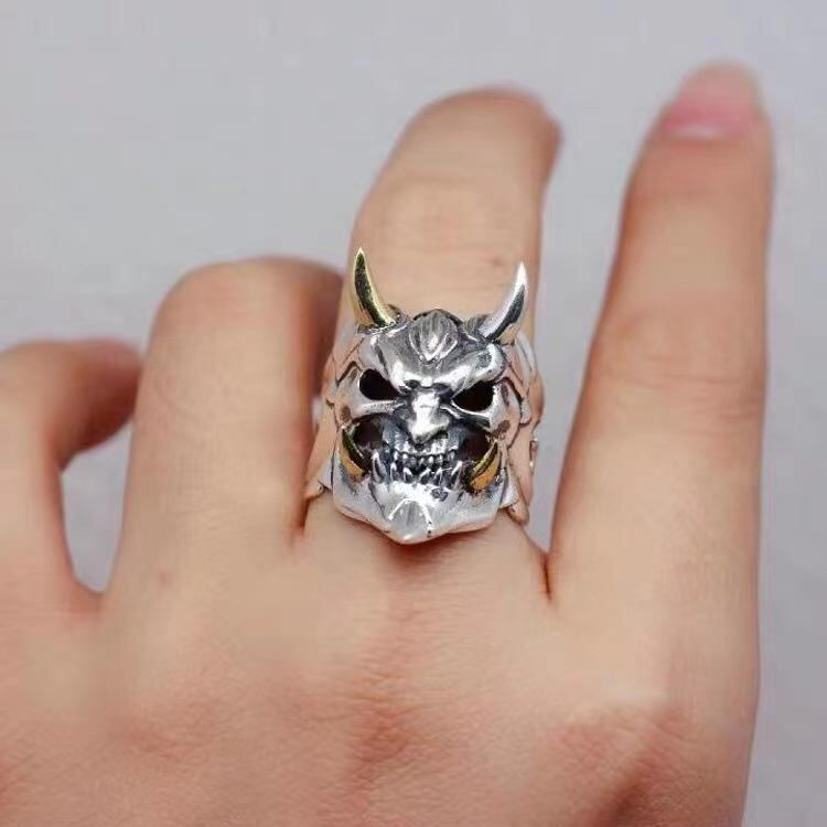 リング 男女兼用 メンズ レディース 合金 般若面 スカル 骸骨 ドクロ オープンリング フリーサイズ バイカラー ツートーン 電鍍加工 個性的 ロック パンク ファッション 指輪