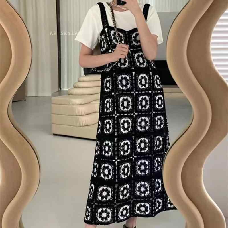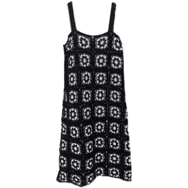 ワンピース レディース 夏 ロング丈 Aライン ゆったり レトロ キャミソール レース クロシェ編み コットンブレンド ブラック 普段使い きれいめカジュアル