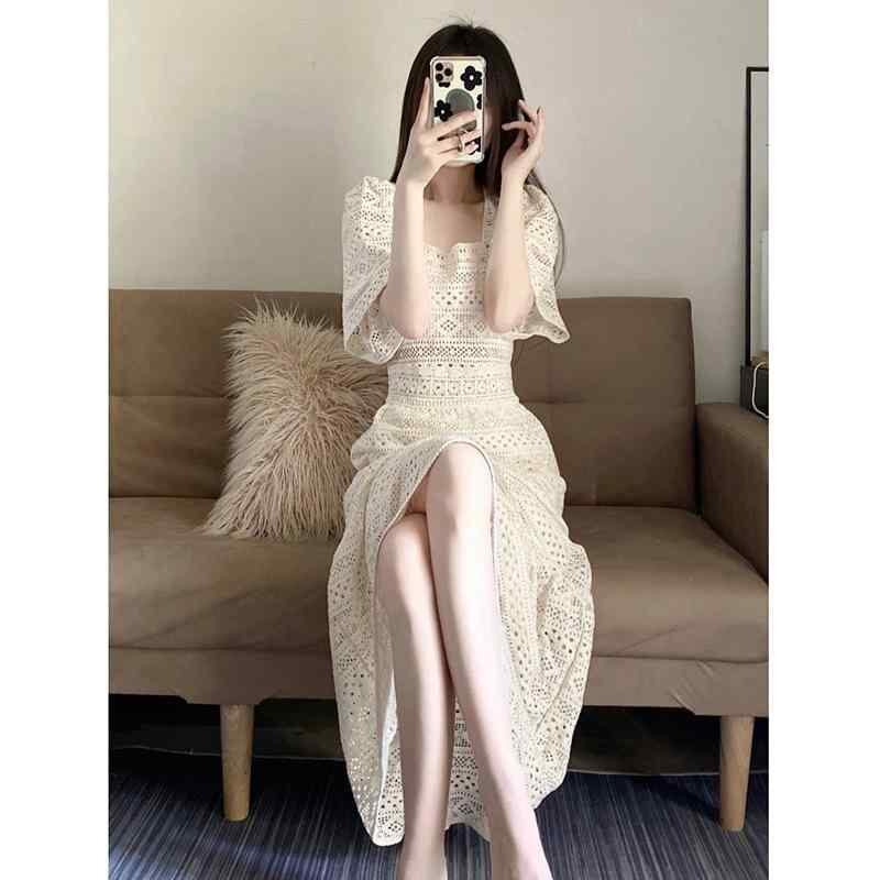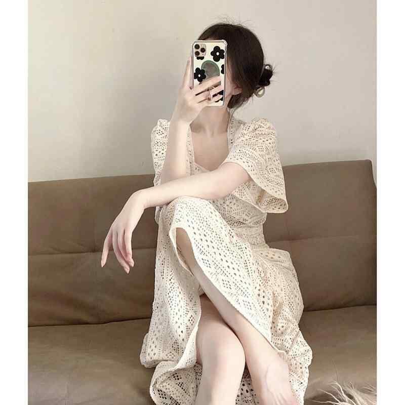 ワンピース レディース フレンチスタイル エレガント きれいめ スクエアネック パフスリーブ 半袖 レース 透け感 Aライン ハイウエスト ロング丈 着痩せ効果 コットン 再生繊維 ベージュ