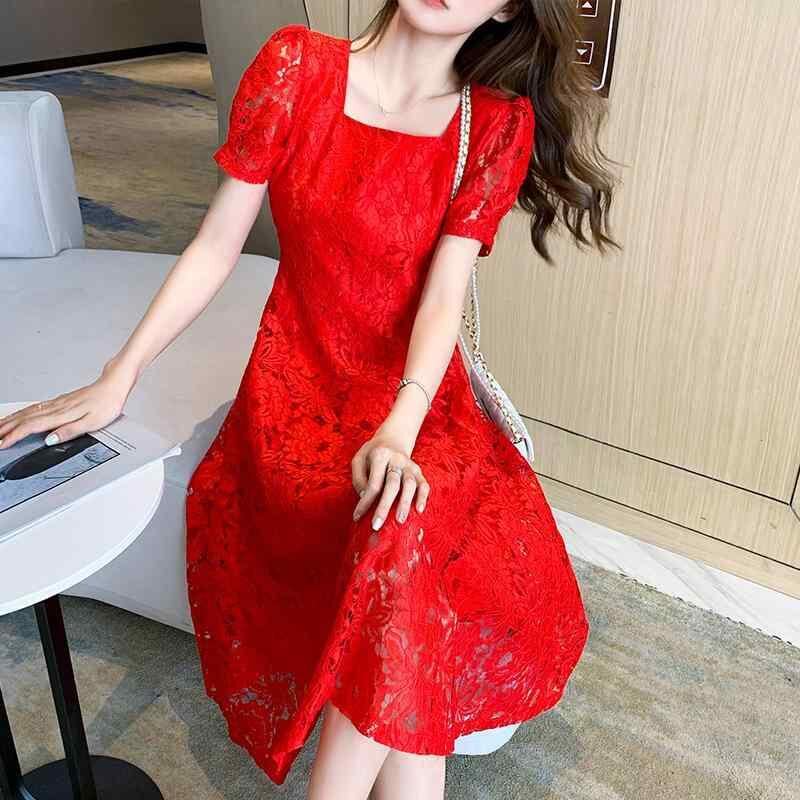 ワンピース レディース レース ロング丈 ふんわり エレガント フェミニン 大きいサイズ ゆったり スクエアネック 半袖 ハイウエスト Aライン きれいめ 切り替えデザイン 清楚 ロマンティック 通勤 オフィス ポリエステル