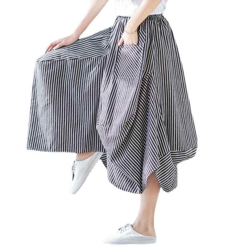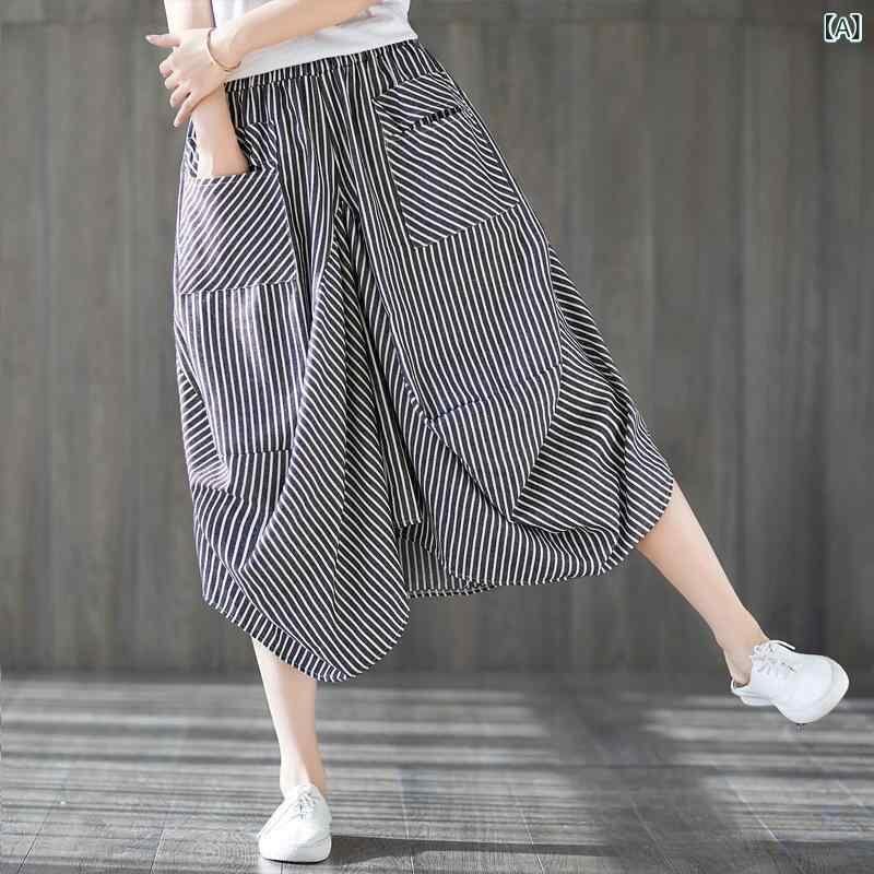 スカート レディース 女性用 綿麻 リネン素材 ゆったり リラックスフィット バルーンスカート ふんわりシルエット ストライプ柄 ウエストゴム ゴムウエスト ミディ丈 ミドル丈 レトロ ナチュラル カジュアル 切り替え ボトムス