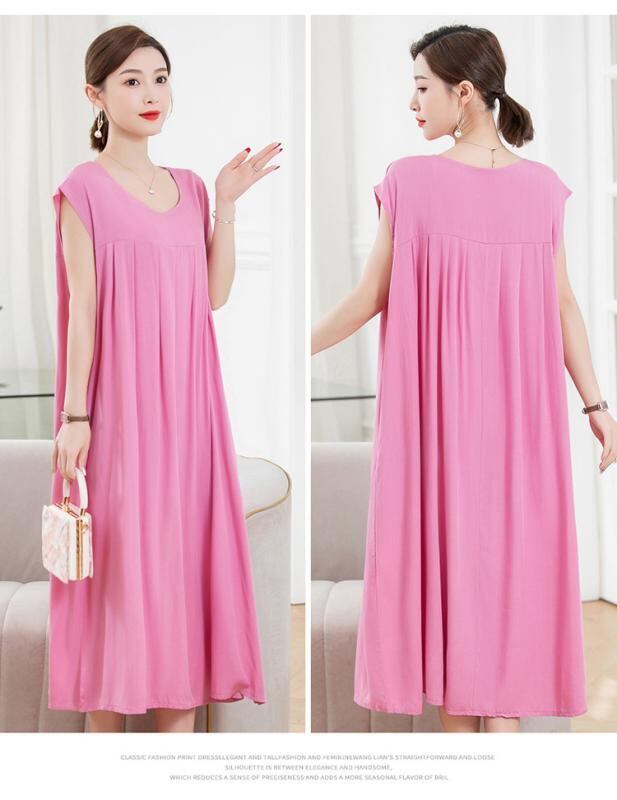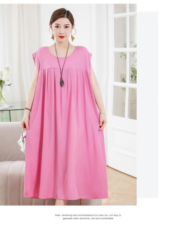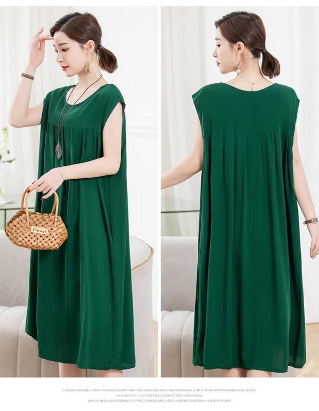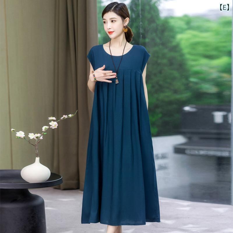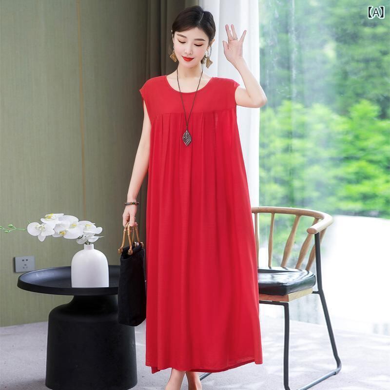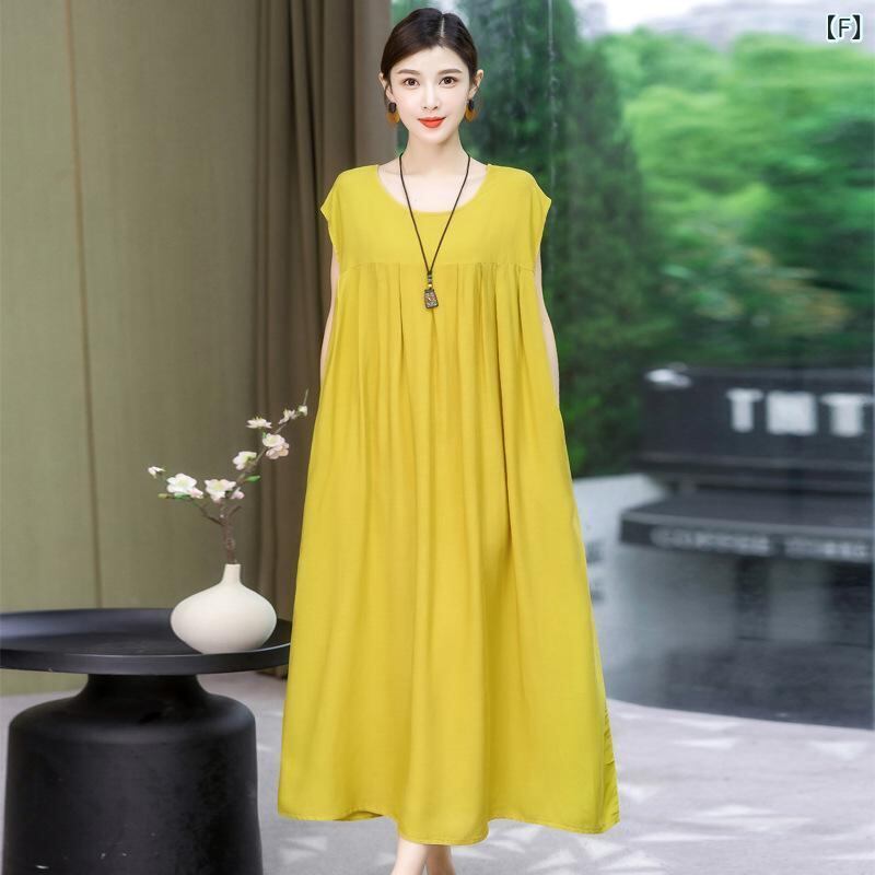 ワンピース レディース 夏 リゾート ビーチ カジュアル マキシ丈 フレア ノースリーブ プルオーバー 大きいサイズ プラスサイズ 体型カバー ゆったり 無地 クルーネック 綿混 レーヨン混 スラブコットン 快適