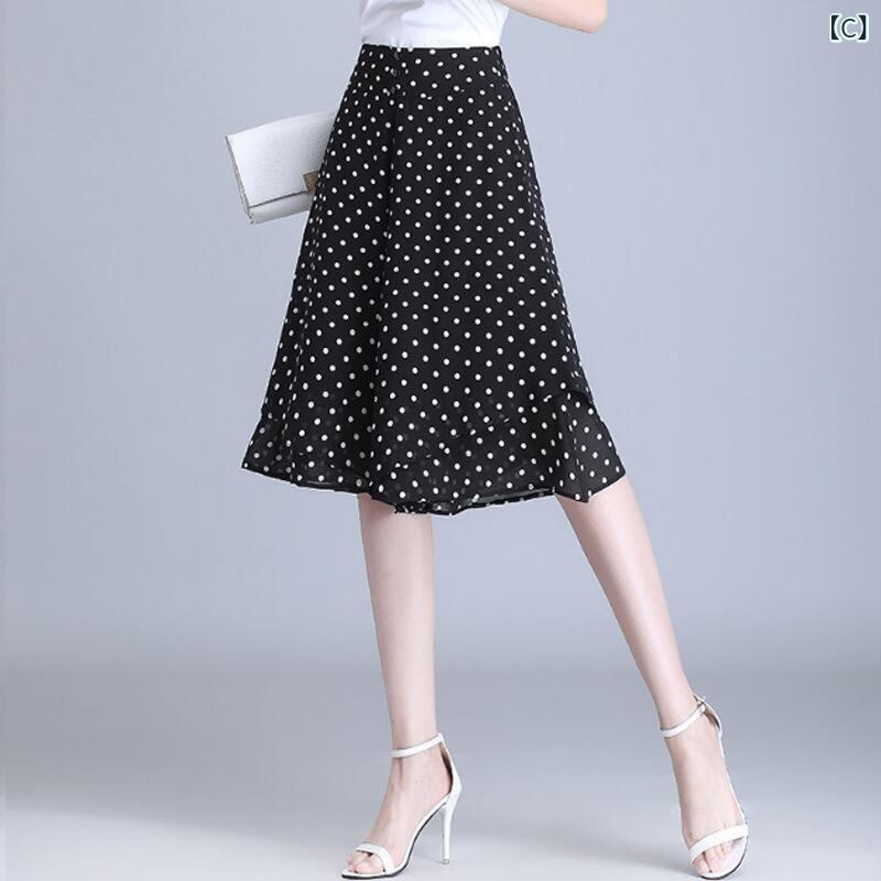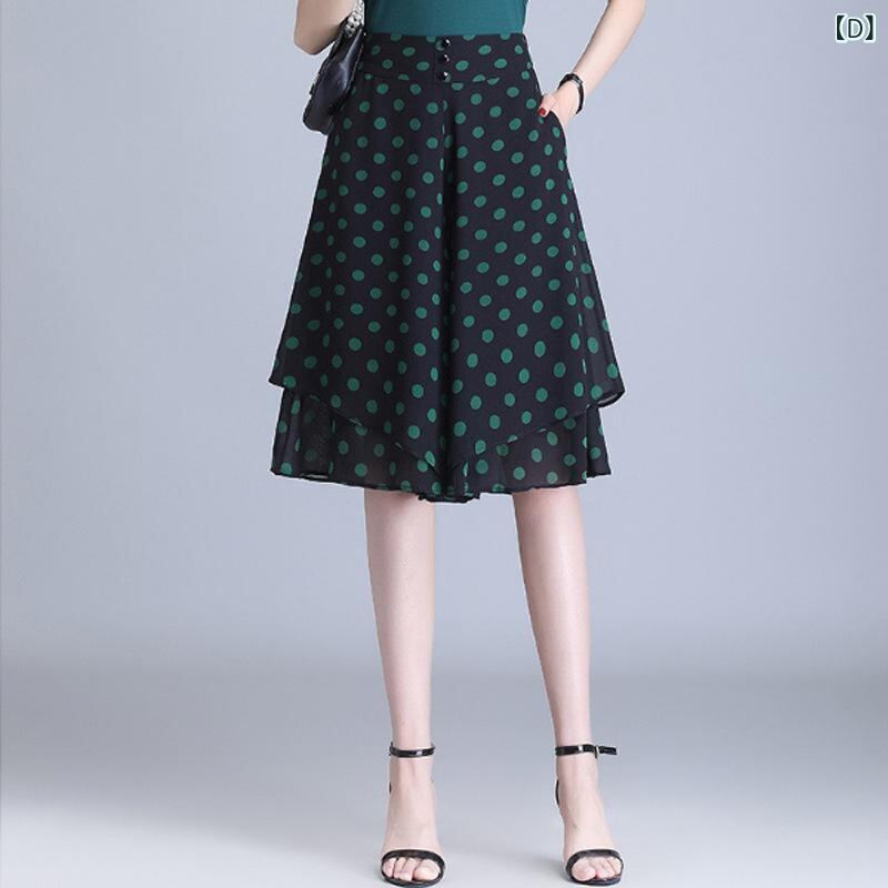 スカンツ レディース 韓国風 Aライン ワイドパンツ ミディ丈 ハイウエスト シフォン 体型カバー ゆったり 大きいサイズ プリーツ加工 伸縮性 ドット柄 カジュアル