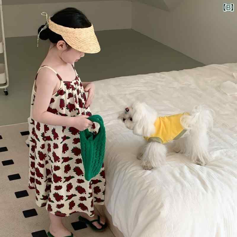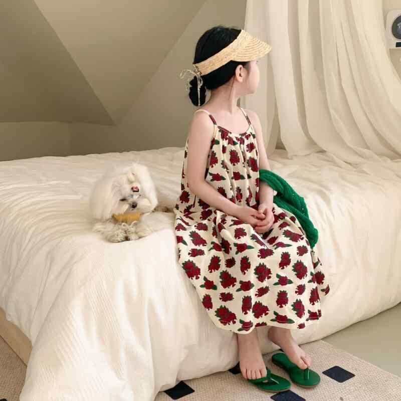 キッズ 女の子 韓国風 おしゃれ キャミソール ノースリーブ ロング丈 ワンピース 綿 コットン 総柄 バラ柄 花柄 夏 サマードレス 普段使い カジュアル
