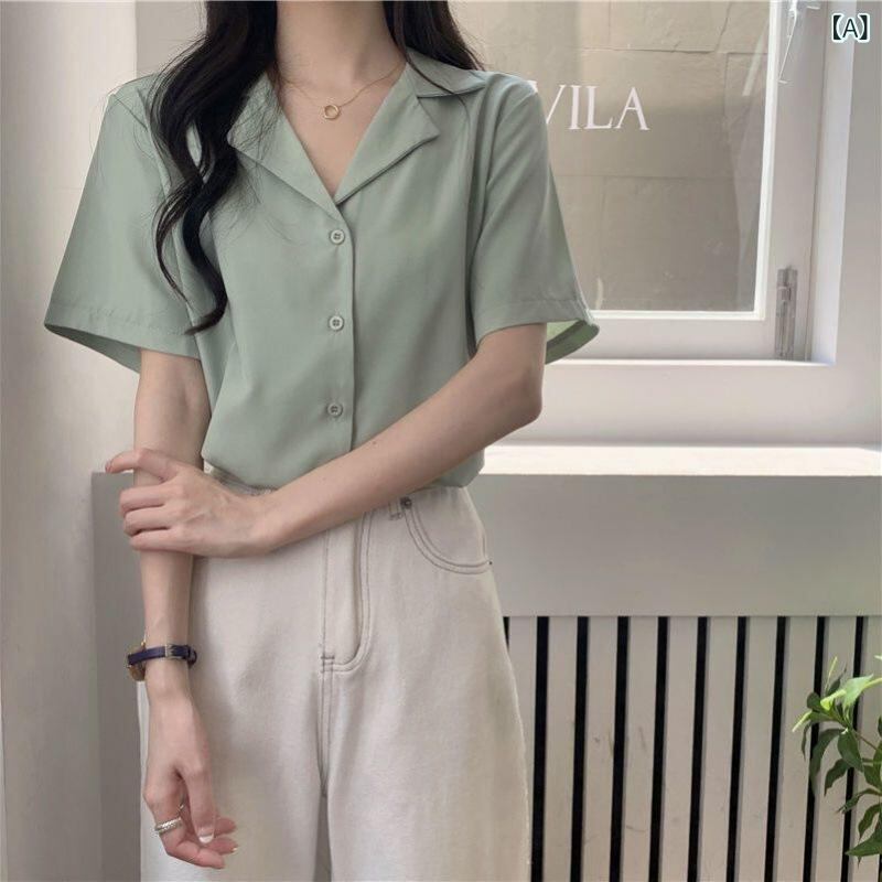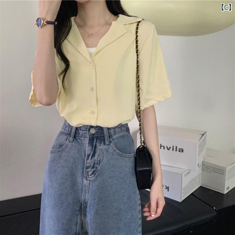 シャツ レディース 高級感 テーラードカラー 半袖 ブラウス レトロ 韓国ファッション 万能 シフォン ポリエステル素材 デイリーユース オフィス カジュアル ライトグリーン ホワイト ライトイエロー ブラック