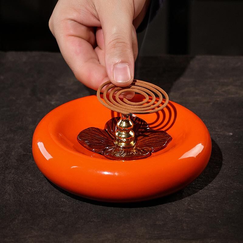 香炉 柿モチーフ 陶器製 線香立て 渦巻き線香皿 香台 大型 和風 茶道 置物 飾り物 癒し リラックス 瞑想 玄関 リビング 書斎 開運 縁起物