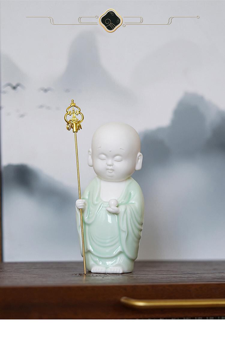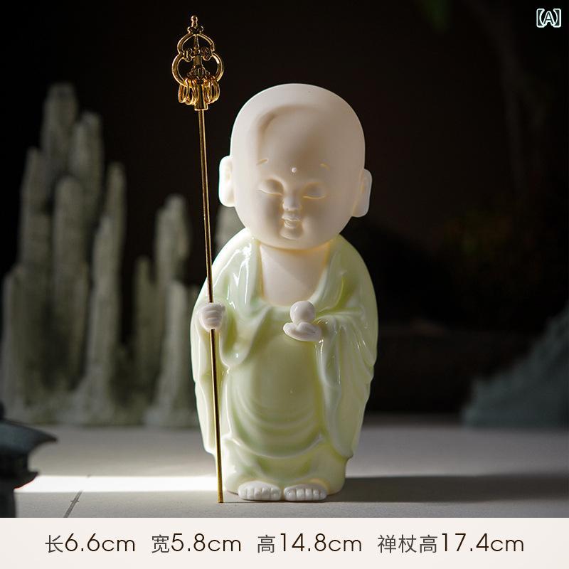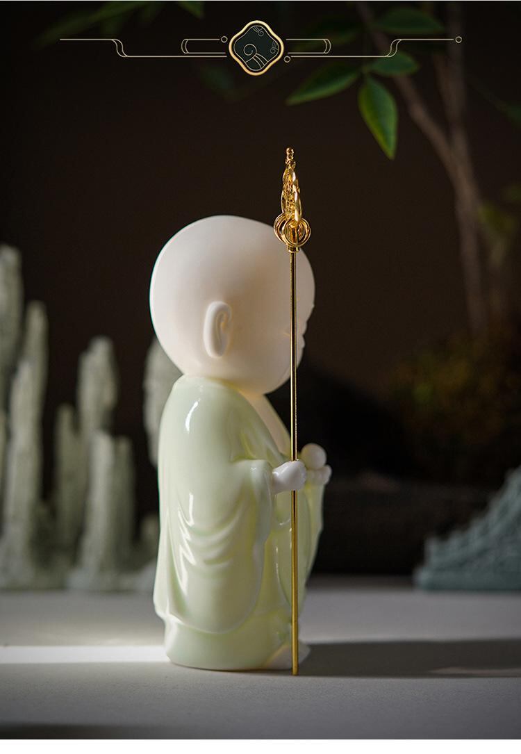 置物 禅風 杖持ち 小僧 白磁 青磁 陶磁器 工芸品 ユニーク おしゃれ かわいい 癒やし インテリア 玄関 リビング 卓上 デスク 和室 書斎 和モダン オブジェ 家庭用 装飾品