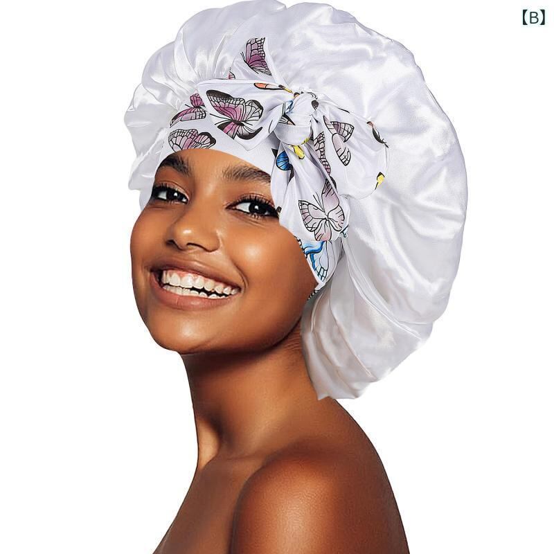 ナイトキャップ レディース サテン シルク調 ワイドバンド ロングテール リボン付き 花柄プリント ゆったりサイズ 美髪ケア 寝癖防止 摩擦軽減 保湿 通気性