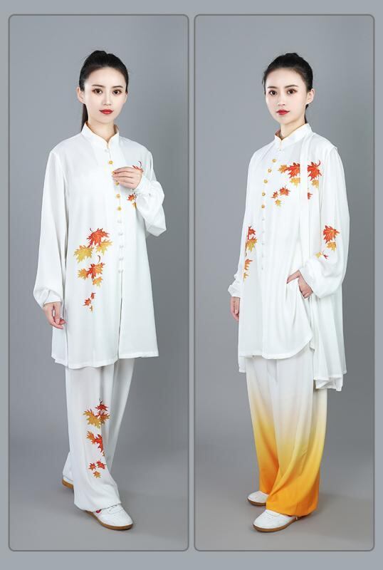 太極拳ウェア 男女兼用 試合 演武 練習着 武術 競技会用 グラデーション 楓葉柄 透け感デザイン 軽量 吸湿速乾 伸縮性 再生繊維混紡 高級感
