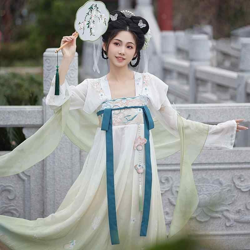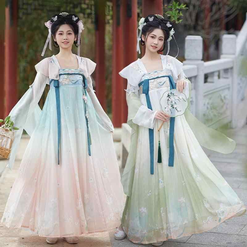 漢服 レディース ハイウエスト ワンピース ショール セットアップ ポリエステル 普段使い カジュアル リラックスウェア 軽やか 優雅 ふんわり グラデーション ピンク系 グリーン系 ブルー系
