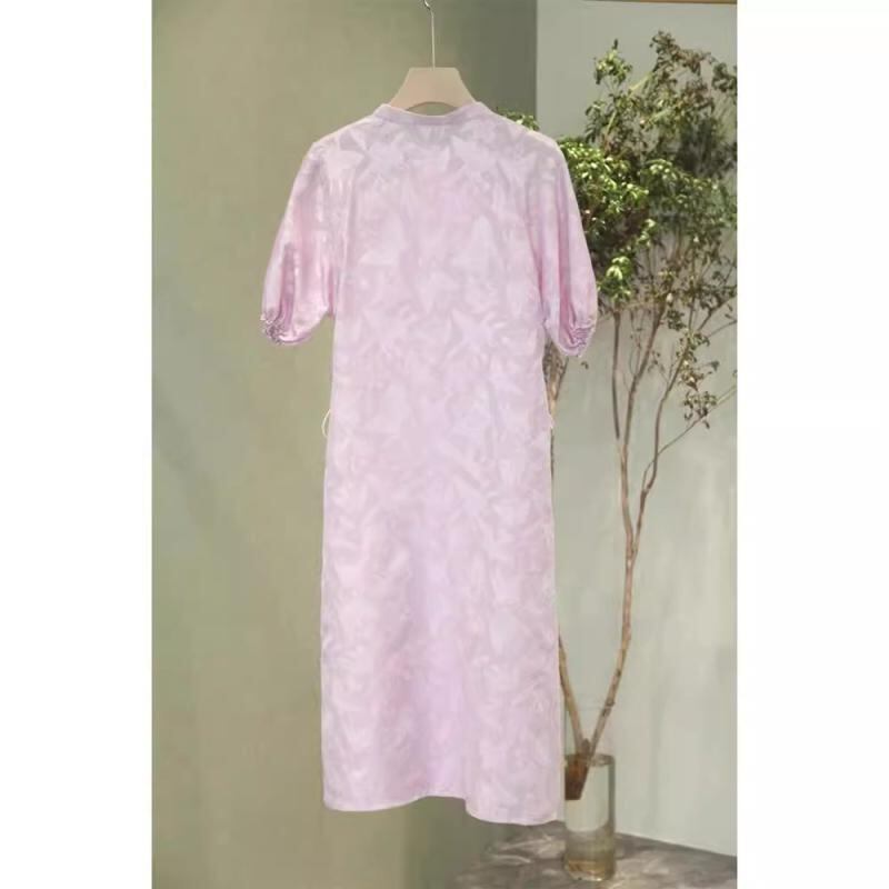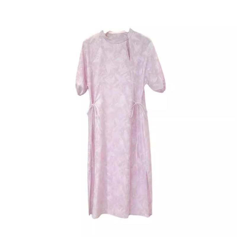 ワンピース レディース 新中国風 禅テイスト 高級感 エレガント レトロ スリムシルエット ロング丈 Aライン ハイウエスト プリント 半袖 ラウンドネック ポリエステル素材 清涼感 淡いパープル