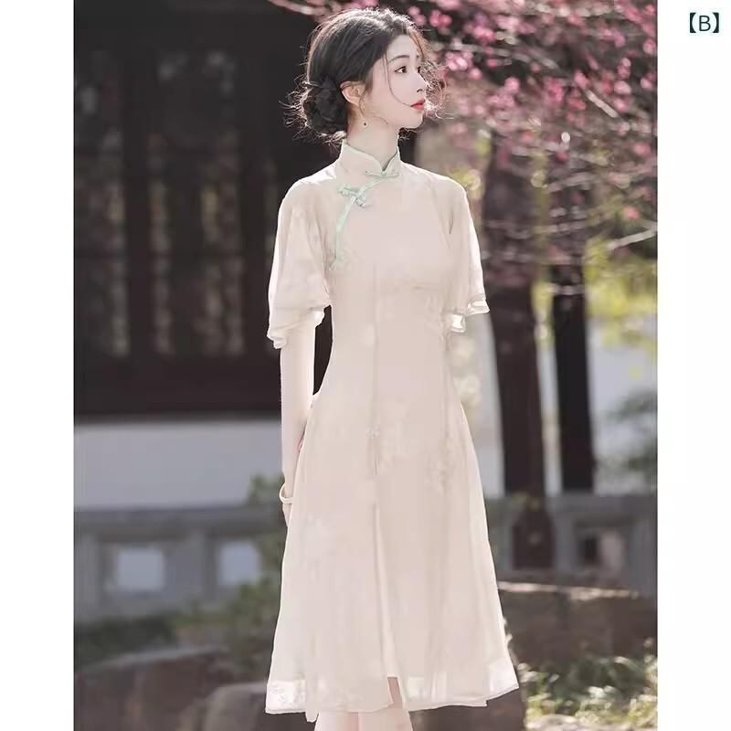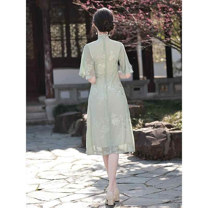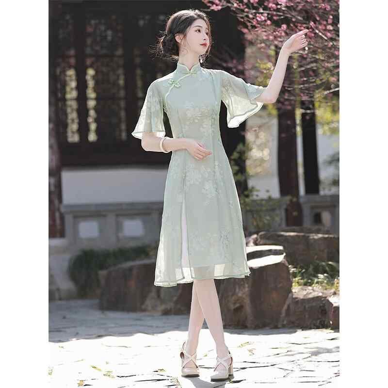ワンピース レディース モダン チャイナドレス ロング丈 スタンドカラー 七分袖 斜め襟 ハイサイドスリット シフォン ポリエステル素材 グリーン 若々しい 爽やか 高級感 上品 エレガント 夏用