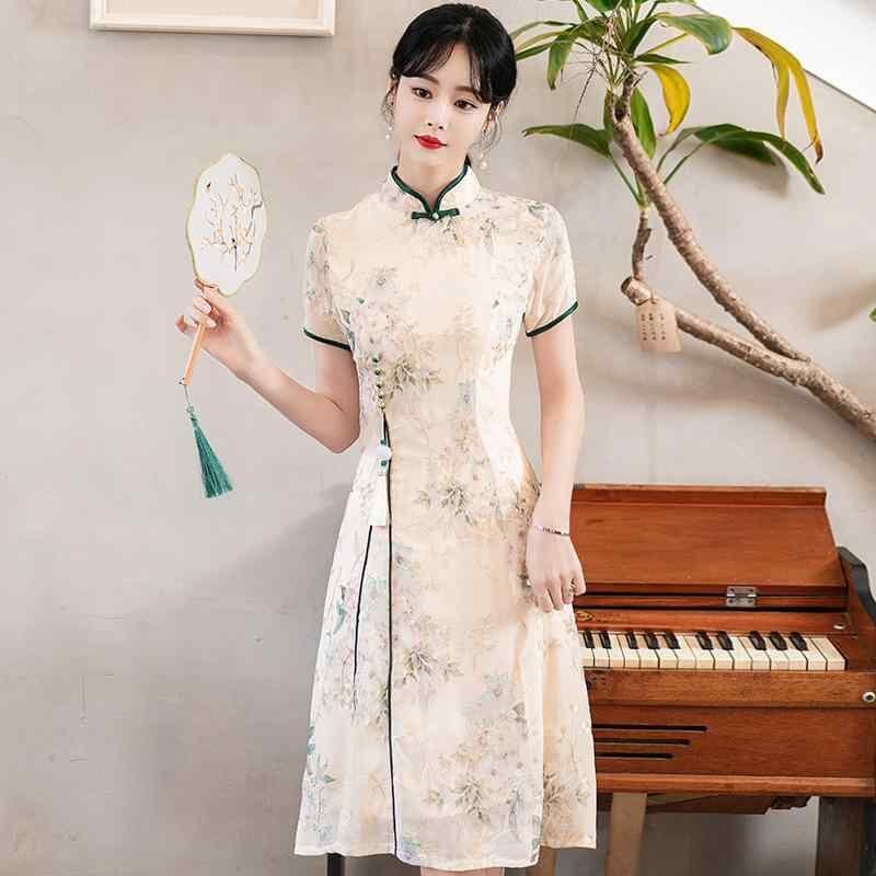 ワンピース レディース レトロ ヴィンテージ シフォン素材 中華風 モダンチャイナ 改良 チャイナドレス風 ミモレ丈 半袖 スタンドカラー 上品 エレガント アプリコットベージュ 普段使い お出かけ フォーマルシーン