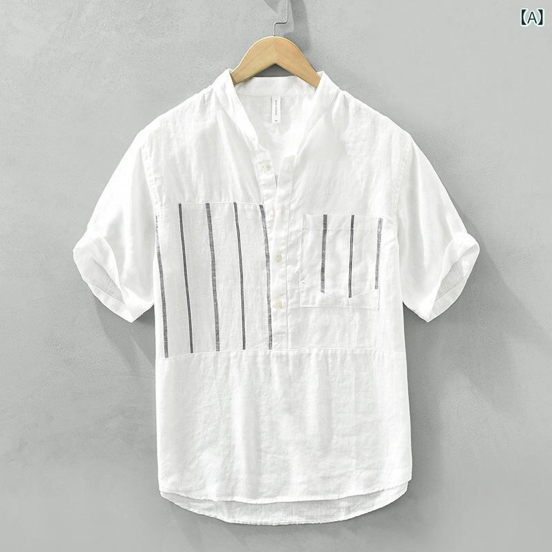 シャツ メンズ 男性用 スタンドカラー 立ち襟 麻 リネン 半袖 ゆったり オーバーサイズ リラックスフィット カジュアル シンプル 普段使い デイリーユース 通気性 吸湿速乾 薄手 軽量 ウォッシャブル イージーケア 白 黒 ホワイト ブラック