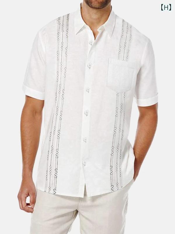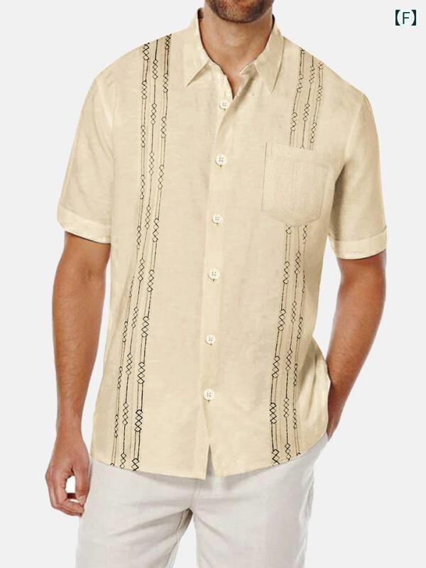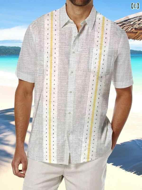 シャツ メンズ 男性用 半袖 ゆったり ルーズフィット ストライプ柄 プリント 総柄 オープンカラー 襟付き 通気性 ポリエステル混紡 大人カジュアル 普段使い トップス