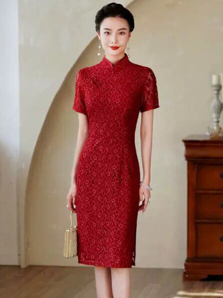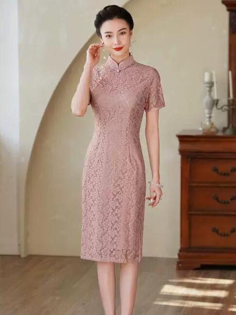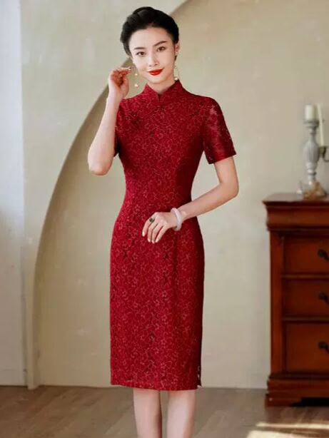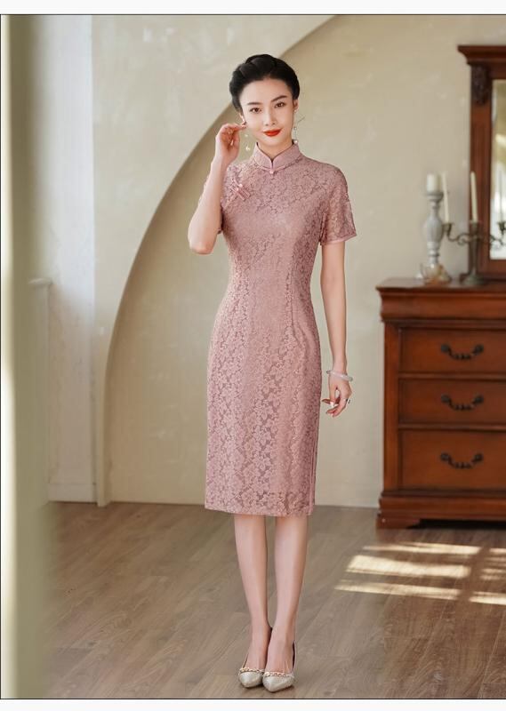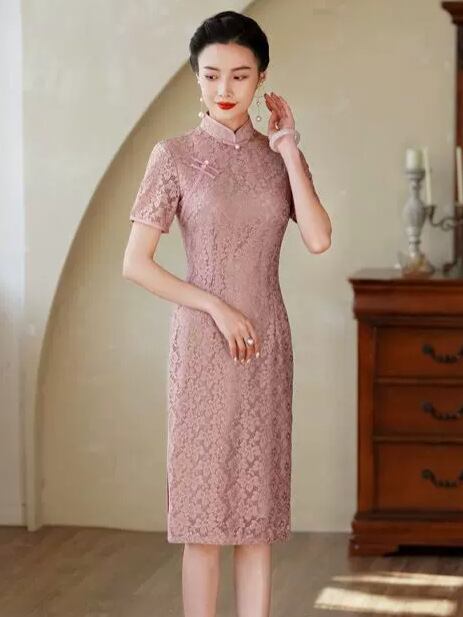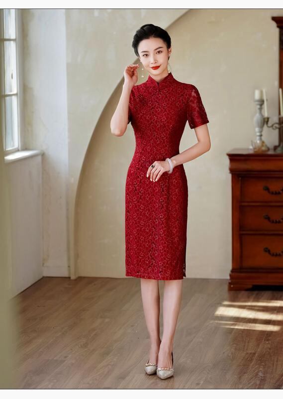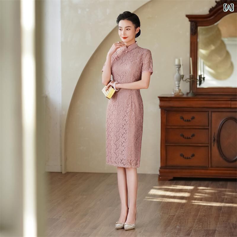 チャイナドレス レディース 改良型 新中国風 レース ロング丈 エレガント 上品 夏 普段使い スタンドカラー 七分袖 斜め襟 スリムフィット 体型カバー ポリエステル素材 立体装飾 レトロモダン