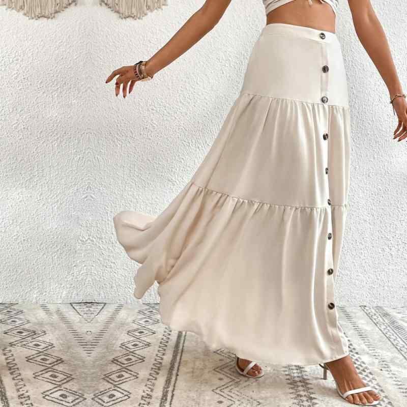 スカート レディース 女性用 ウエストゴム ティアードスカート ロング丈 エレガント カジュアル リゾート 普段使い 無地 ポリエステル アプリコット ベージュ系 リラックス 快適