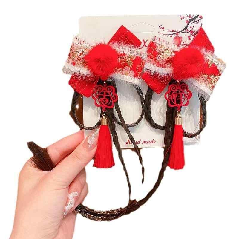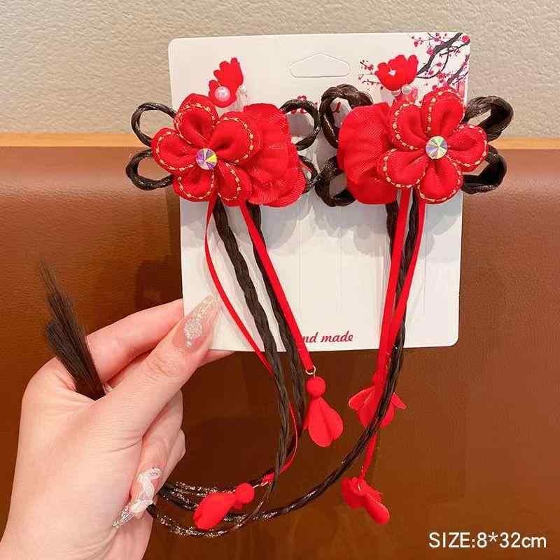 髪飾り 女の子 キッズ 中国風 リボン 三つ編み つけ毛 タッセル 中華風 漢服 お正月 髪留め ヘアピン レトロ 民族風 パール 手作り ヘッドドレス 飾り帯 かわいい