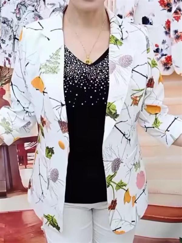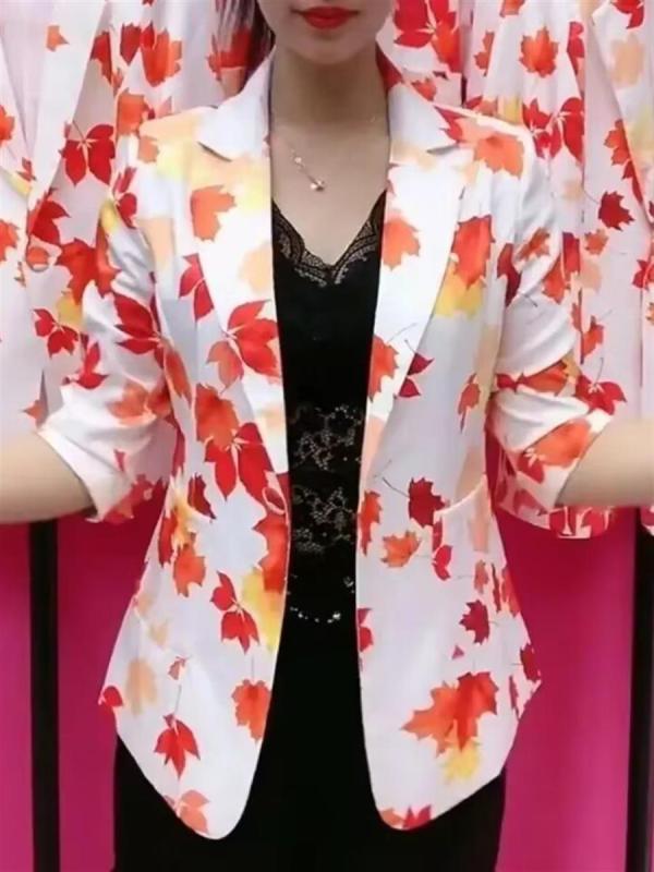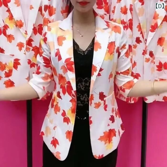 ジャケット レディース 薄手 洋風 小洒落 ポリエステル 花柄 プリント スリムフィット スーツ アウター 緑葉 紅花 水墨画 楓の葉 ボヘミアンスタイル