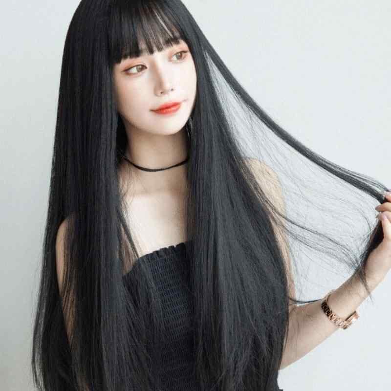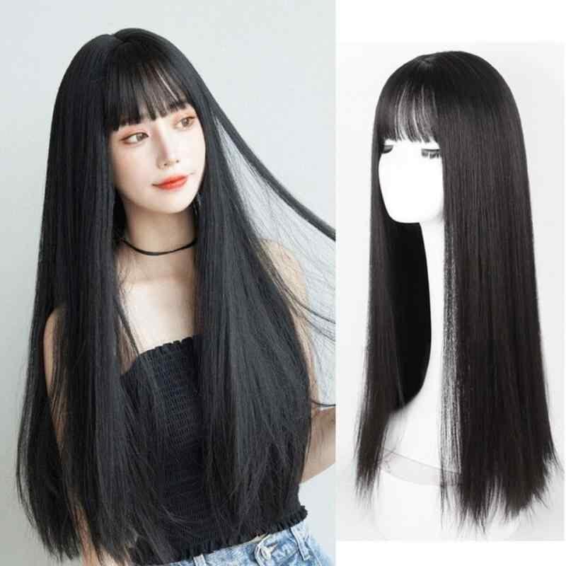ウィッグ レディース ロングストレート フルバングス パッツン前髪 耐熱ファイバー 自然な艶感 デイリー使い 高品質 ブラック ダークブラウン ライトブラウン フルウィッグ