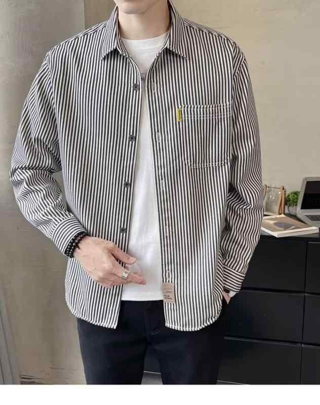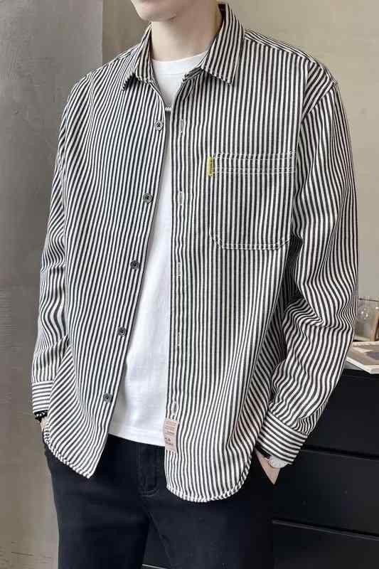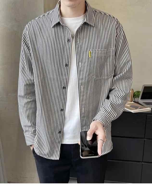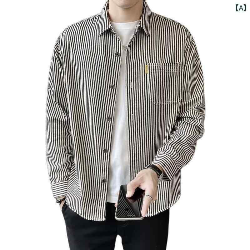 シャツ メンズ ストライプ柄 長袖 ゆったり ビッグシルエット カジュアル 春秋 ポリエステル混紡 綿混素材 通気性抜群 イージーケア ライトアウター 普段使い ストリートファッション 韓国風 ファッション