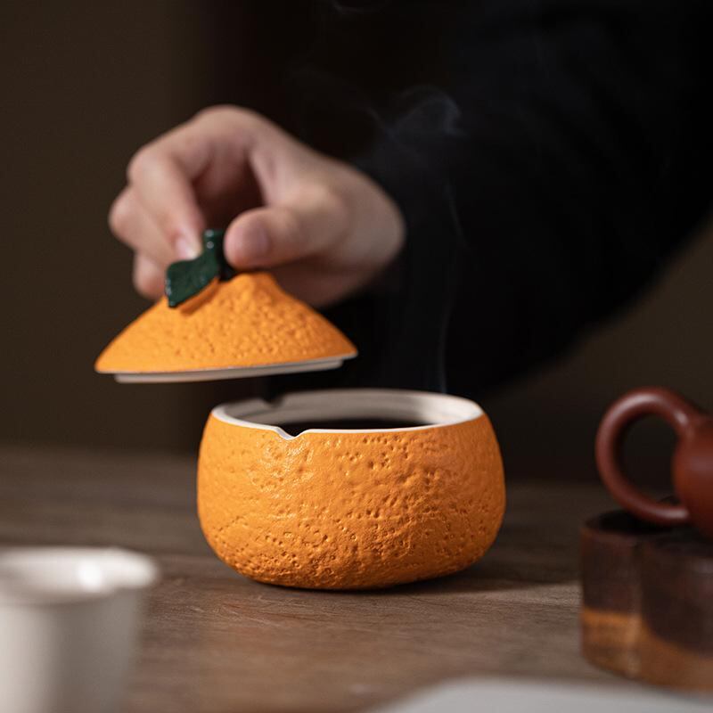 灰皿 陶器製 デコポン型 オレンジ色 蓋付き密閉型 防風 灰飛散防止 家庭用 オフィス用 リビング デスク 卓上 縁起物 開運 ラッキーアイテム インテリア雑貨 ナチュラル おしゃれ