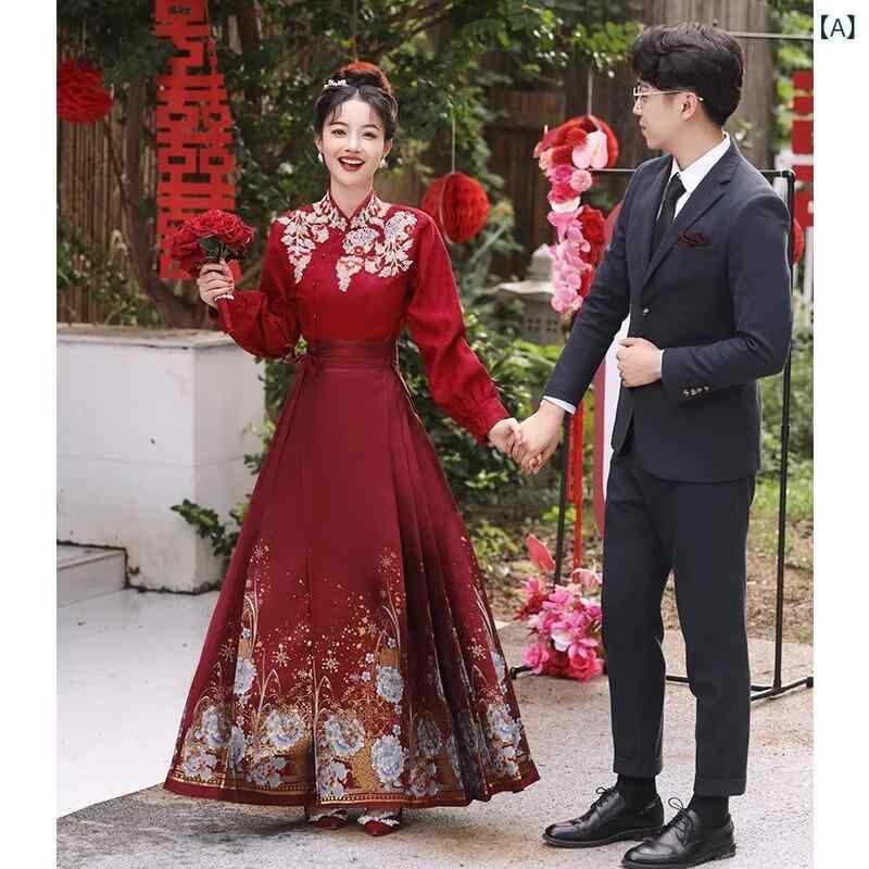ドレス レディース 新チャイナスタイル 中華風 馬面スカート 漢服 披露宴 結婚式 結納 里帰り フォーマルドレス レッド 赤 長袖 ロング丈 ポリエステル スタンドカラー 斜め襟 ウエストマーク Aライン プリーツ 冬