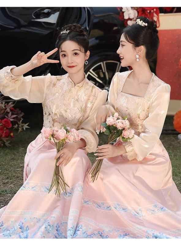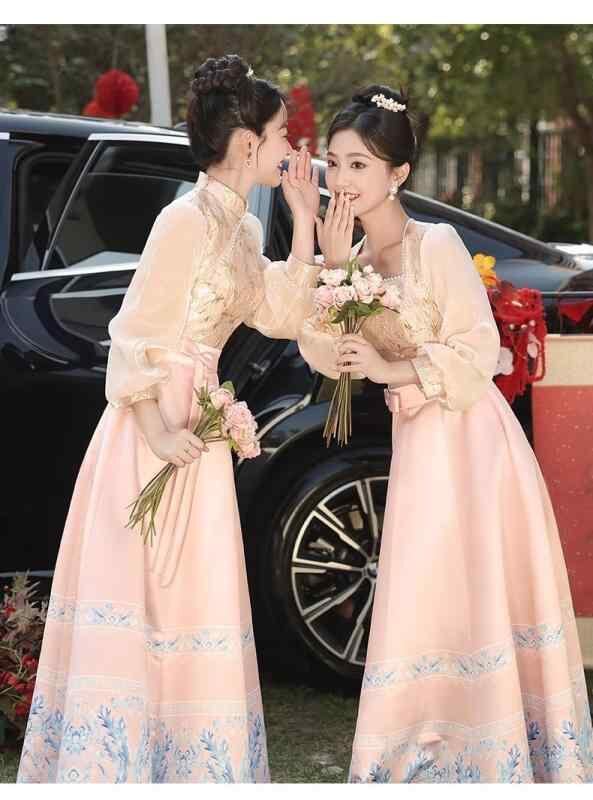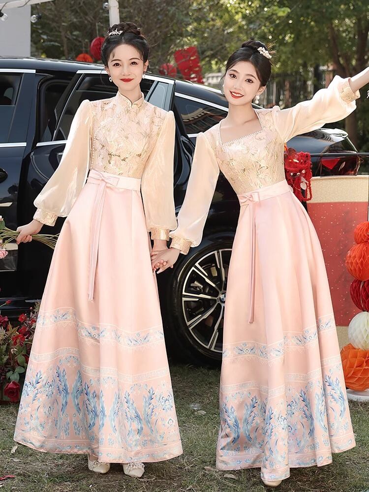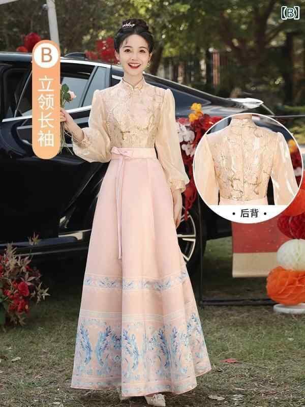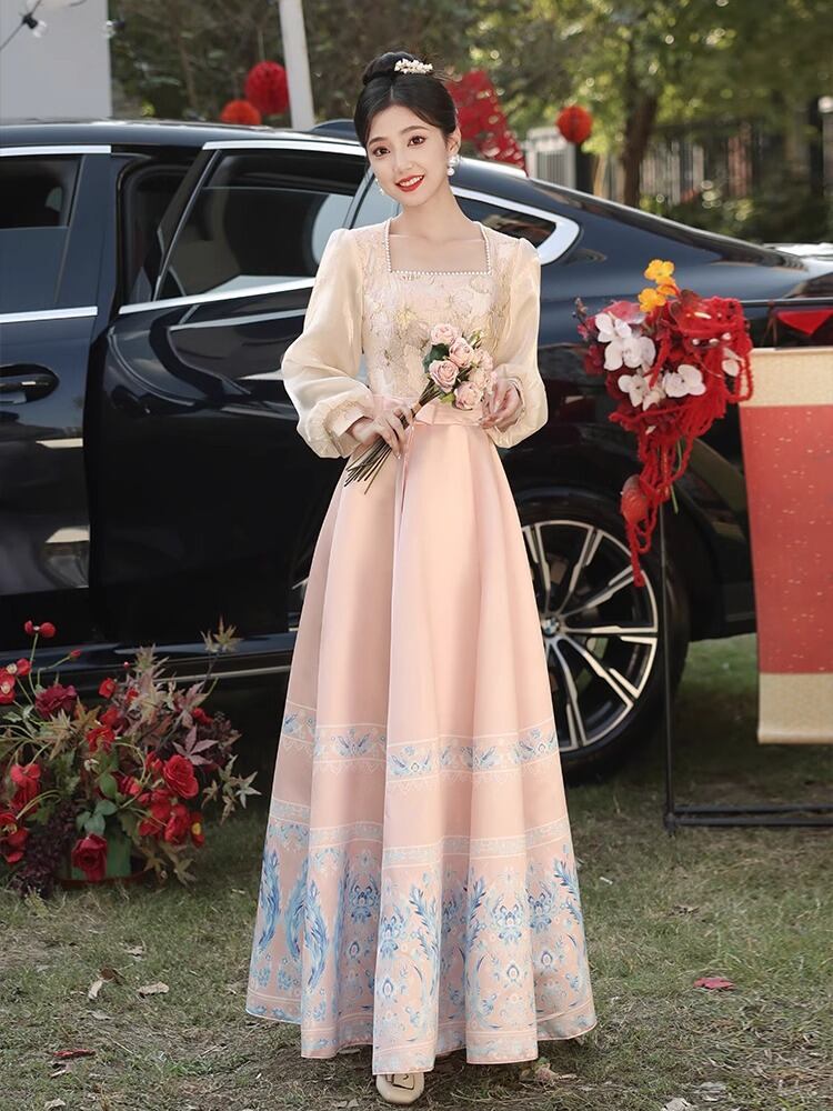ロングドレス レディース 新中華風 結婚式 披露宴 花嫁 ブライズメイド パーティードレス ピンク 馬面スカート スクエアネック Aライン 長袖 エレガント フォーマル