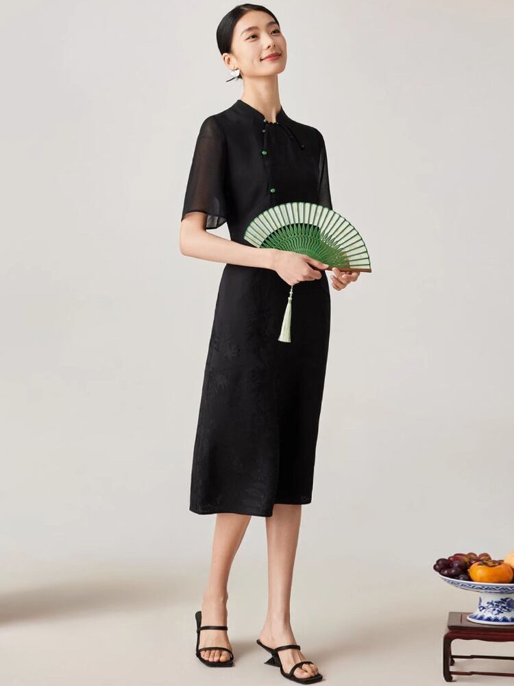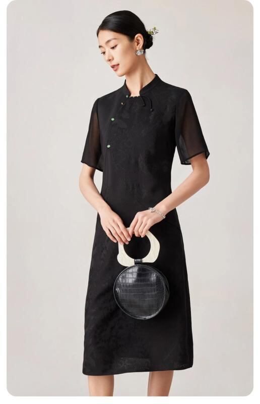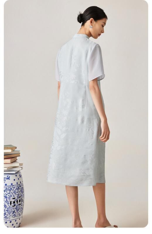 ワンピース レディース 新中国風 改良チャイナドレス 桑蚕シルク ジャカード織り 花柄 半袖 ミディ丈 Aライン スタンドカラー プルオーバー オフホワイト ブラック アイスブルー ヌードピンク