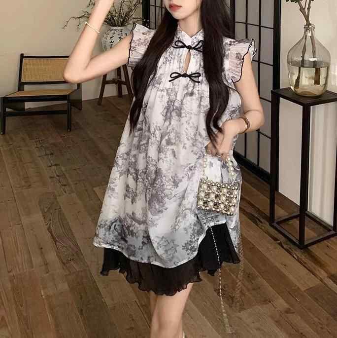 ワンピース レディース モダンチャイニーズスタイル レトロ 水墨画風デザイン Aライン ミニ丈 ノースリーブ フリル袖 ハイウエスト ウエストマーク 細見え効果 スタンドカラー エレガント 通勤スタイル ポリエステル素材