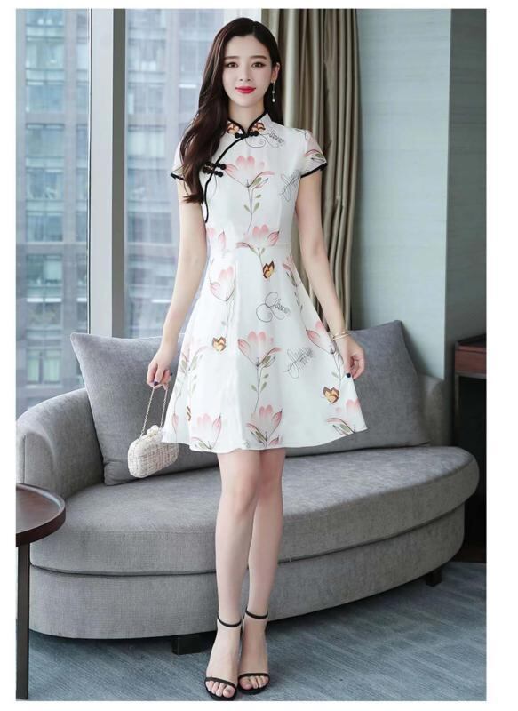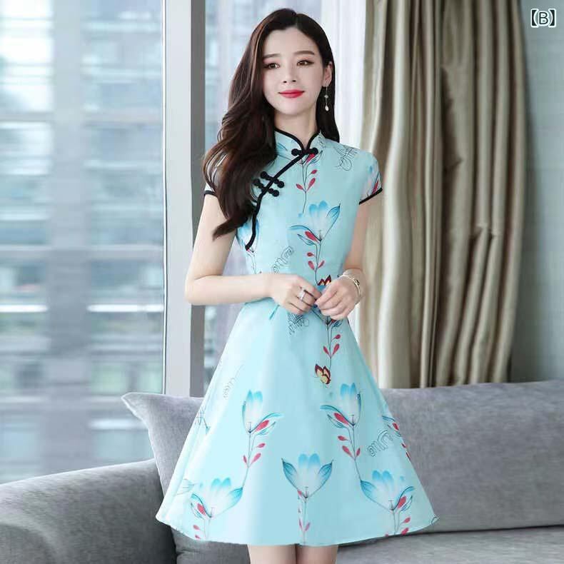 ワンピース レディース レトロ風 改良旗袍 中国風 Aライン ミニ丈 ハイウエスト 半袖 ポリエステル 花柄プリント 細見え スタイルアップ エレガント 通勤 普段使い 白 青