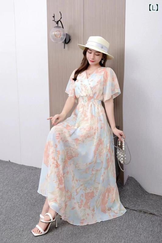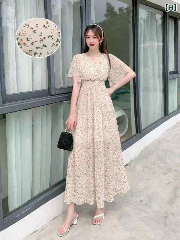 ワンピース レディース シフォン 半袖 ショートスリーブ Vネック Aライン ロング丈 マキシ丈 ストリートファッション 普段使い お出かけ リゾート 体型カバー エレガント