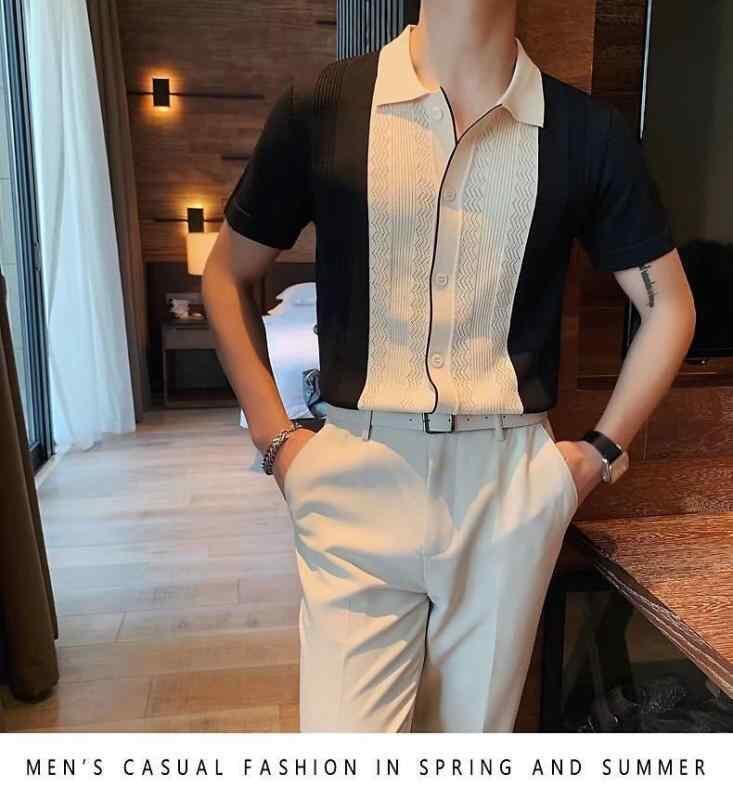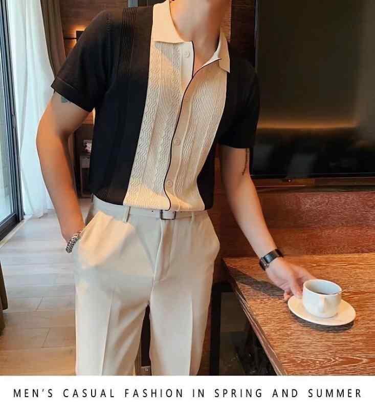 ニットポロシャツ メンズ 男性用 半袖 ショートスリーブ 襟付き 立ち襟 スリムフィット ブリティッシュスタイル 英国風 個性的 トレンド カジュアル ポリエステル イエロー ブラック