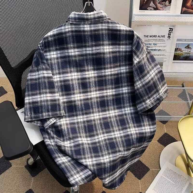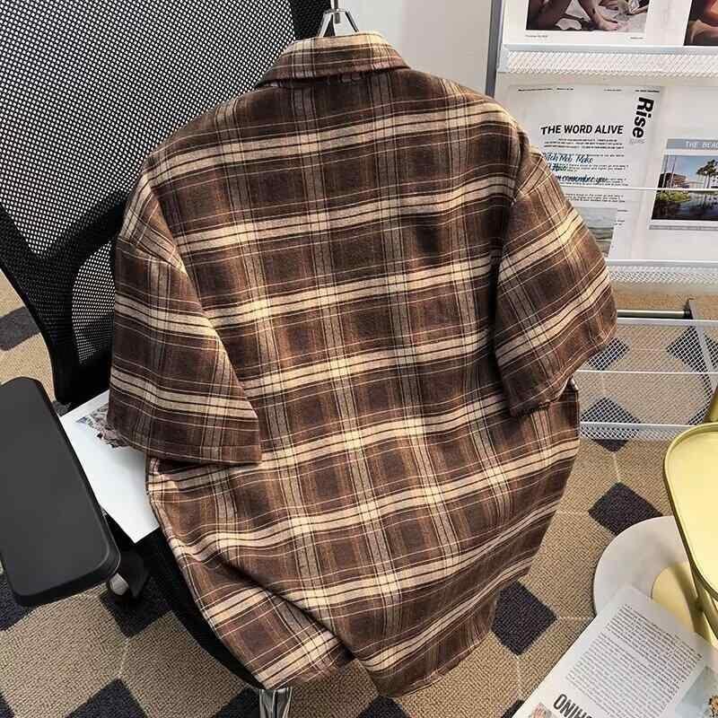 シャツ メンズ 五分袖 チェック柄 レトロ カジュアル ルーズフィット ビッグシルエット ゆったり ポリエステル 綿混 襟付き 夏物 ライトアウター 普段使い デイリーユース アメカジ ブルー ブラウン シワになりにくい イージーケア