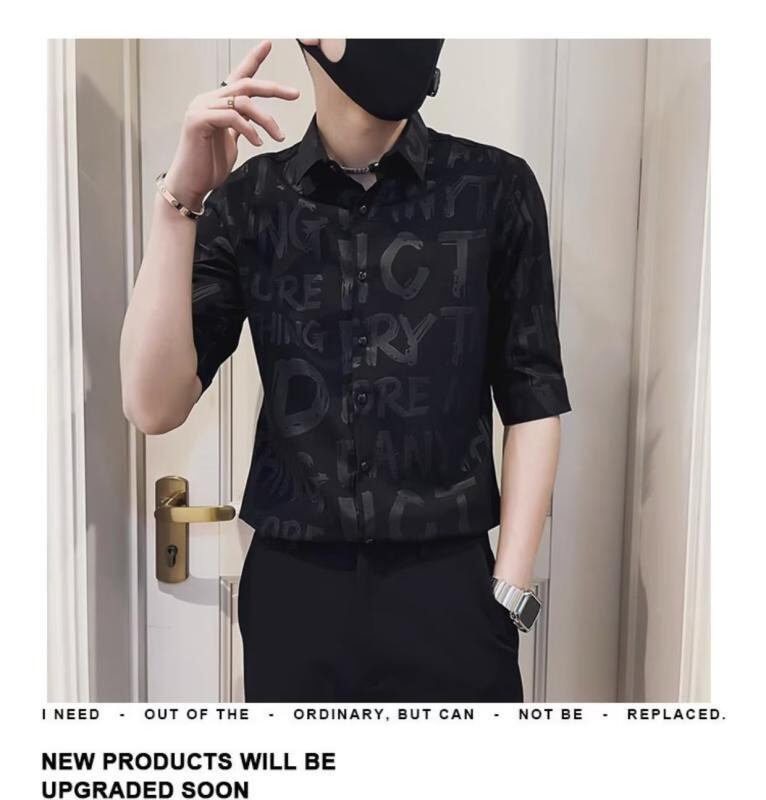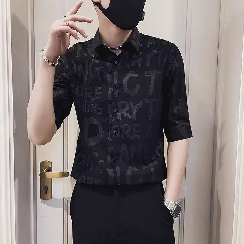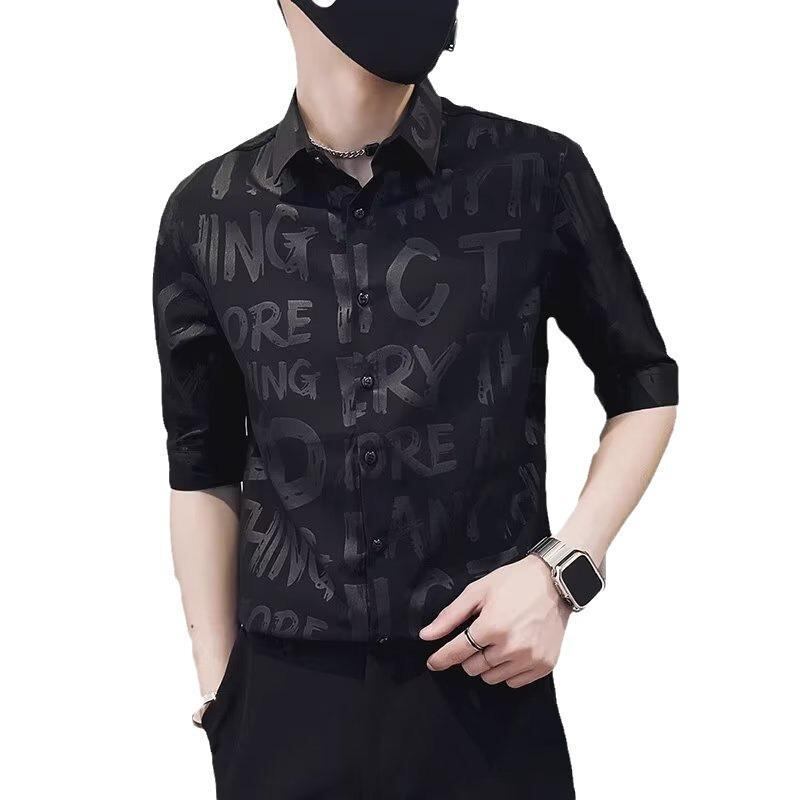シャツ メンズ 七分袖 ゆったり ルーズフィット 襟付き レタープリント アルファベット柄 綿混 ポリエステル素材 洗濯可能 イージーケア 夏 普段着 ストリート カジュアル 白 黒