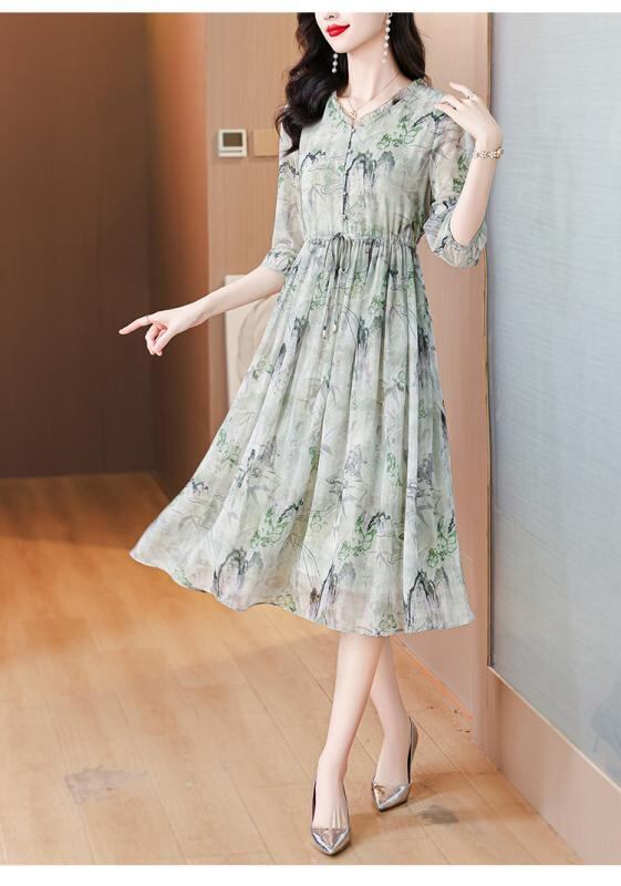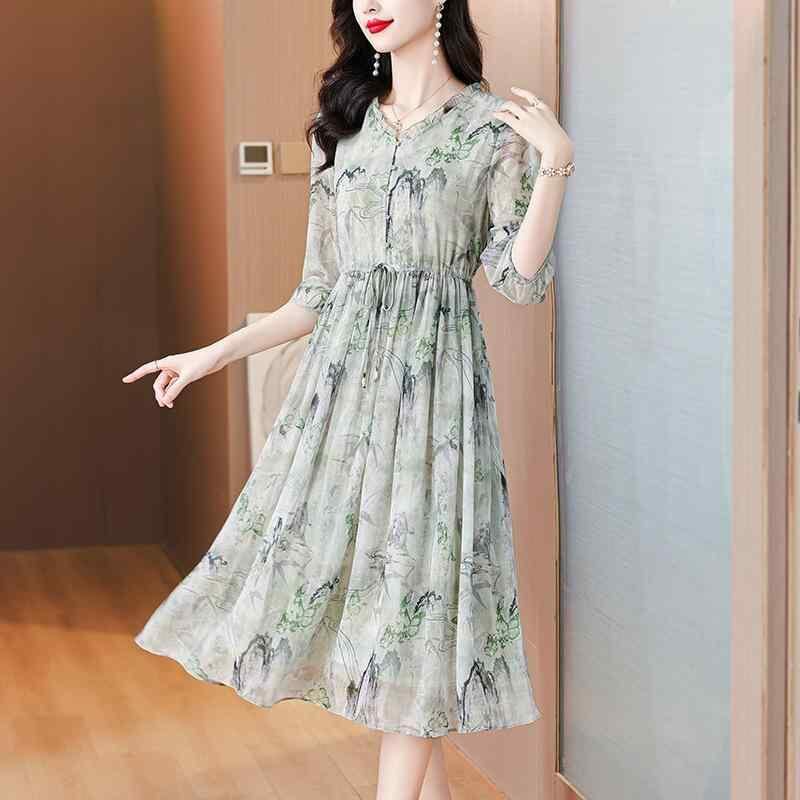 ワンピース レディース 桑蚕シルク シルク 高級感 ゆったり サイズ 体型カバー フレンチ スタイル 大人 きれいめ メローフリル 花柄 ミモレ丈 Aライン ラウンドネック 五分袖 ハイウエスト リゾート エレガント レトロ カジュアル