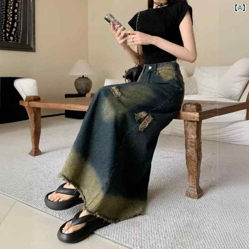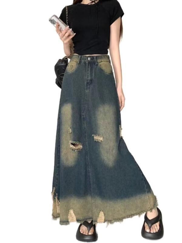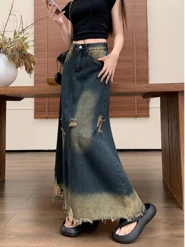デニムスカート レディース ダメージ加工 切りっぱなし フリンジ Aライン ゆったり 大きいサイズ 体型カバー 着痩せ 細見え ミディ丈 ボトムス ヴィンテージ レトロカラー 綿 コットン ポリエステル デイリー カジュアル 無地