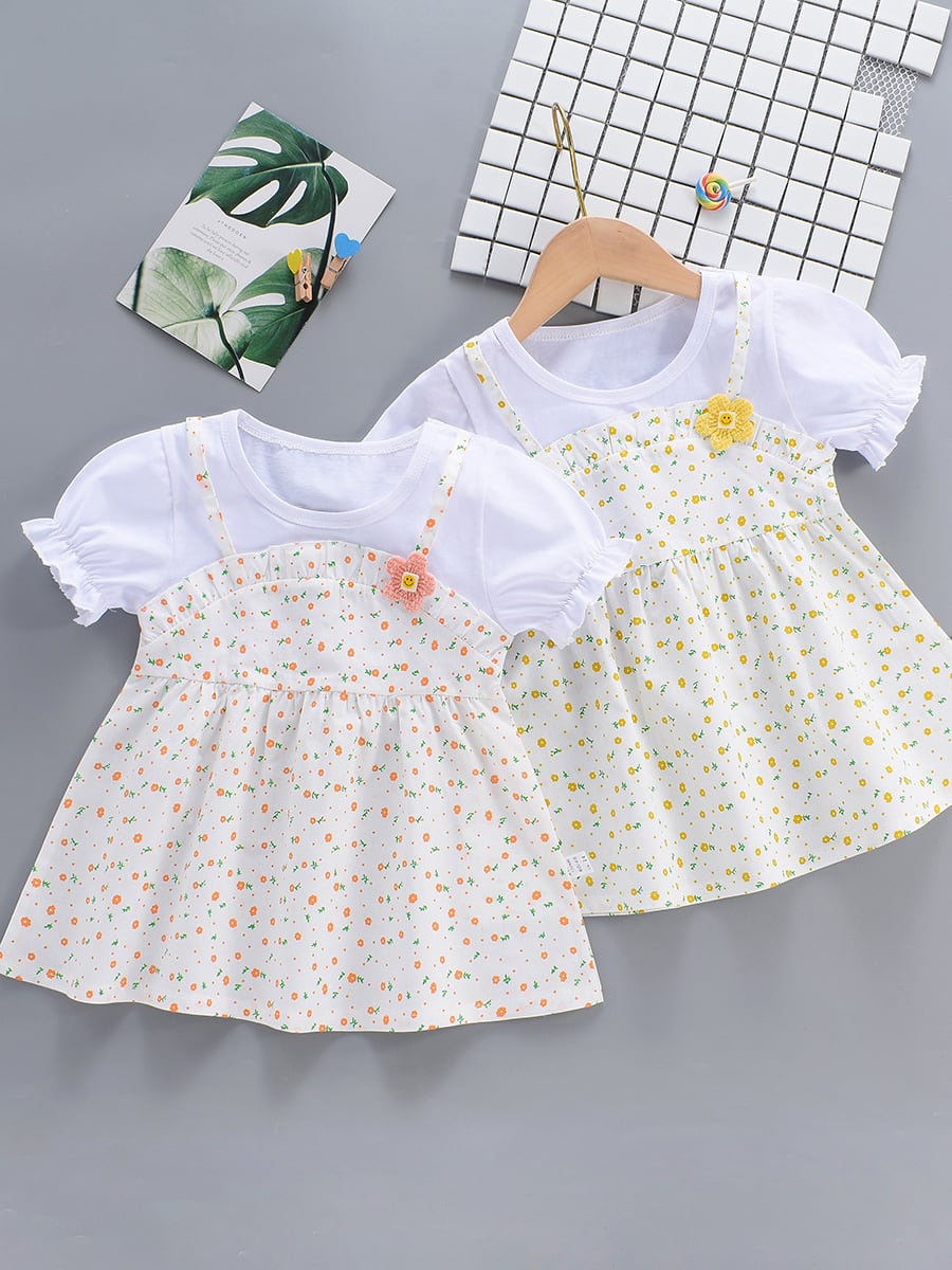 ワンピース 女の子 ベビー キッズ 半袖 薄手 夏服 重ね着風 キャミソール 小花柄 花柄 Aライン 綿 かわいい おしゃれ 通園 お出かけ 普段使い ピンク イエロー