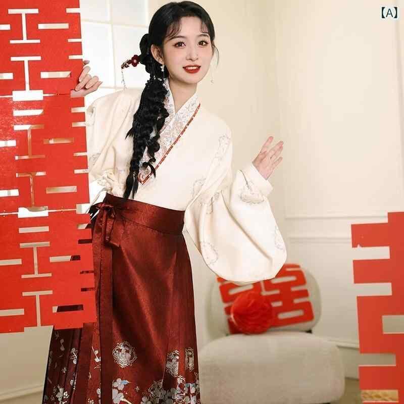 漢服 オリジナルデザイン レディース 明代様式 琵琶袖 交領上衣 織金花柄 馬面裙 ロングスカート 2点セット 赤 レッド 婚礼衣装 披露宴 秋冬 結婚式 ブライダル パーティードレス ポリエステル 3D立体デザイン