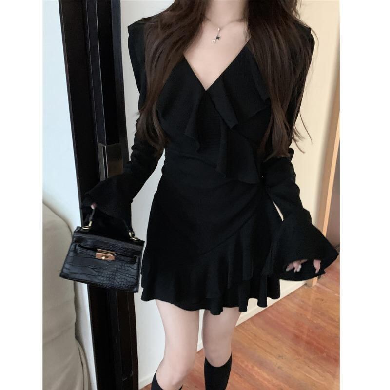 ワンピース レディース 大きいサイズ Vネック 長袖 ハイウエスト ウエストマーク ミニ丈 タイトスカート フリル 高級感 デザイン 体型カバー ポリエステル 無地 ブラック